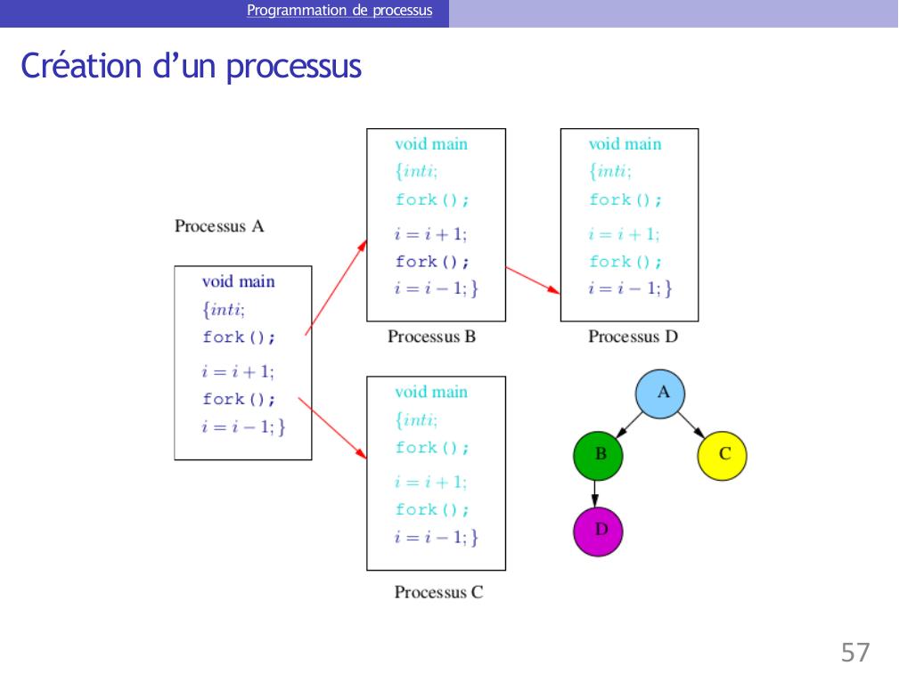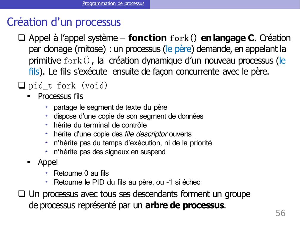 Page 56 : Programmation de processusCréation d’un processusAppel à l’appel système – fonction fork enlangage C. Créationpar clonage mitose : un processus le père demande, en appelant la primitive fork, la création dynamique d’un nouveau processus lefils. Le fils s’exécute ensuite de façon concurrente avec le père.pidt fork voidProcessus filspartage le segment de texte du pèredispose d’une copie de son segment de donnéeshérite du terminal de contrôlehérite d’une copie des file descriptor ouvertsn’hérite pas du temps d’exécution, ni de la prioritén’hérite pas des signaux en suspendAppelRetourne 0 au filsRetourne le PID du fils au père, ou -1 si échecUn processus avec tous ses descendants forment un groupede processus représenté par un arbre de processus.56
