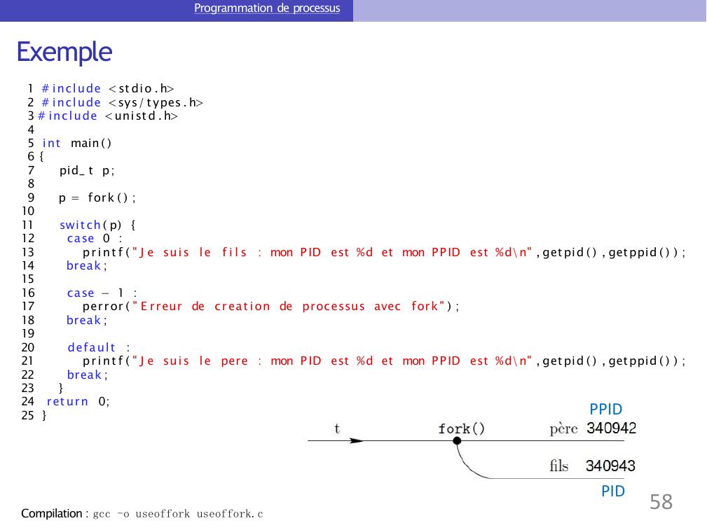 Page 58 : Programmation de processusExemple1 include st dio . h2 include sys/ types . h3 include unist d . h 45 intmain 6 7pid t p; 89p = fork ;1011switch p12case 0 :13pr i nt f " J esuislef i l s: mon P IDest d et mon PPIDest d\n" , getpid , getppid ;14break ; 1516case 1 :17perror " E rreurdecreat iondeprocessus avec fork " ;18break ; 1920default:21pr i nt f " J esuislepere: mon P IDest d et mon PPIDest d\n" , getpid , getppid ;22break ;2324 ret urn0;25 Compilation : gcc -o useoffork useoffork.c58PPIDPID