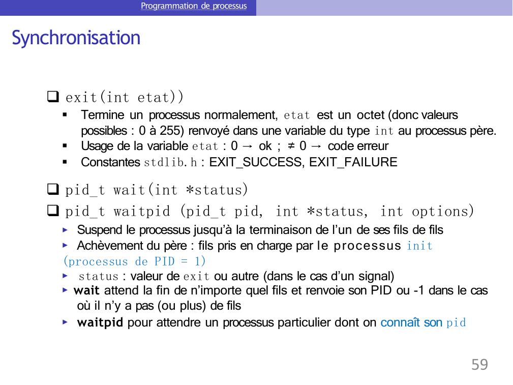 Page 59 : Programmation de processusSynchronisationexitint etatTermine un processus normalement, etat est un octet donc valeurs possibles : 0 à 255 renvoyé dans une variable du type int au processus père.Usage de la variable etat : 0 →ok ; 0 →code erreurConstantes stdlib.h : EXITSUCCESS, EXITFAILUREpidt waitint statuspidt waitpid pidt pid, int status, int options▶Suspend le processus jusqu’à la terminaison de l’un de ses fils de fils▶Achèvement du père : fils pris en charge par le processus initprocessus de PID = 1▶status : valeur de exit ou autre dans le cas d’un signal▶wait attend la fin de n’importe quel fils et renvoie son PID ou -1 dans le cas où il n’y a pas ou plus de fils▶waitpid pour attendre un processus particulier dont on connaît son pid59