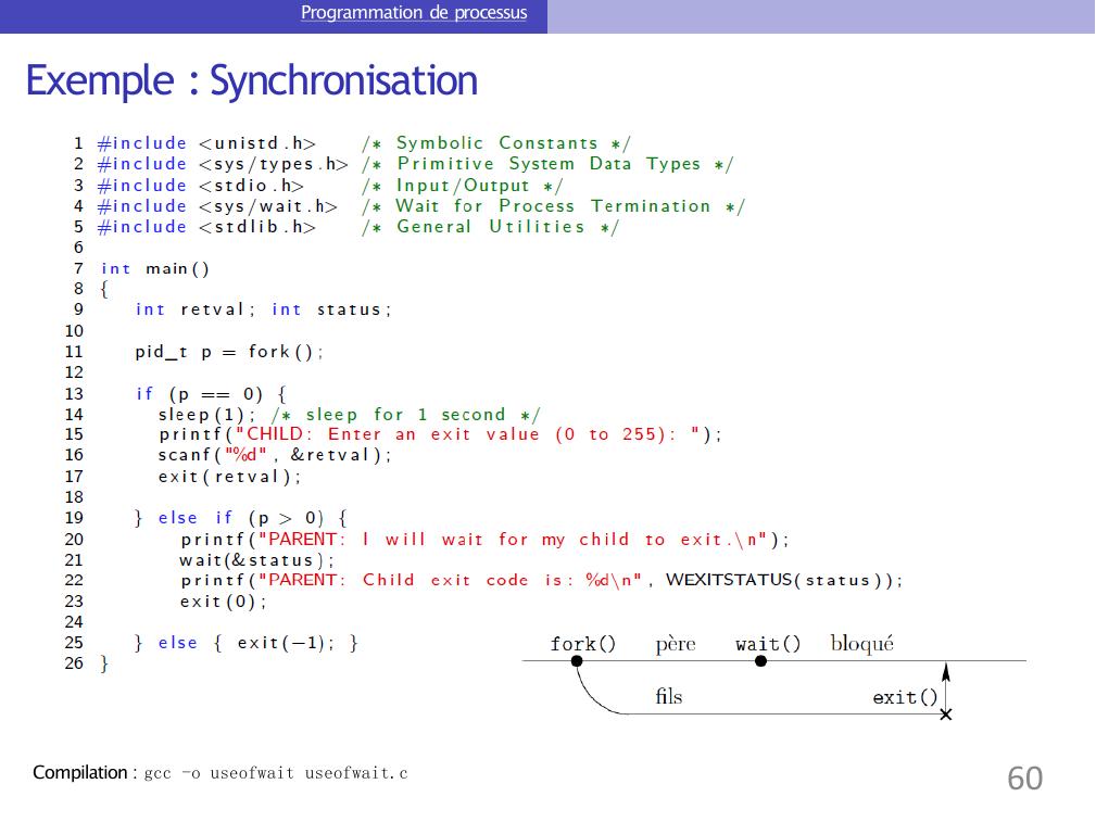 Page 60 : Programmation de processusExemple : SynchronisationCompilation : gcc -o useofwait useofwait.c60