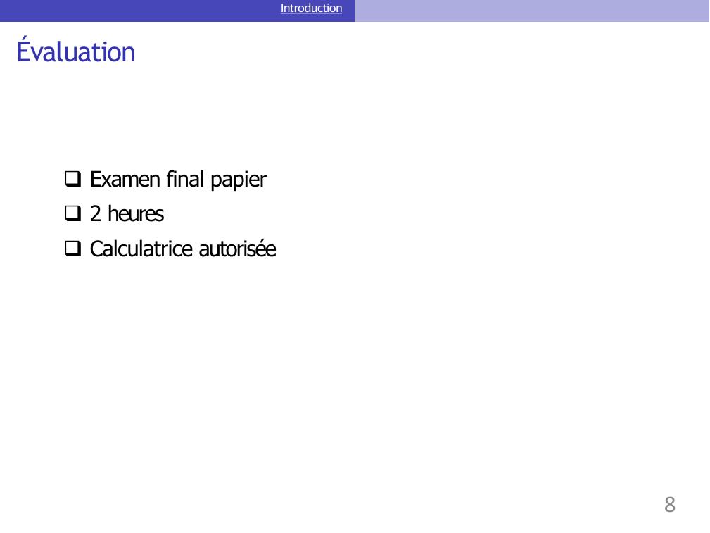 Page 8 : IntroductionÉvaluationExamen final papier2 heuresCalculatrice autorisée8