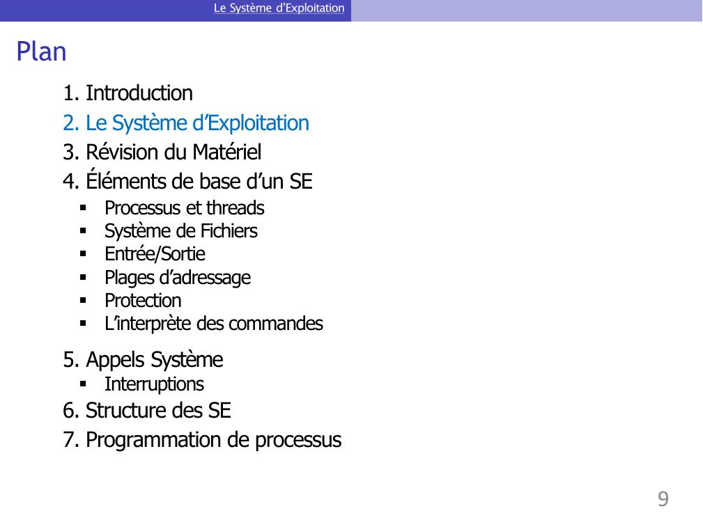 Page 9 : Le Système d’ExploitationPlan1. Introduction2. Le Système d’Exploitation3. Révision du Matériel4. Éléments de base d’un SEProcessus et threads Système de Fichiers Entrée/Sortie Plages d’adressage ProtectionL’interprète des commandes5. Appels SystèmeInterruptions6. Structure des SE7. Programmation de processus9