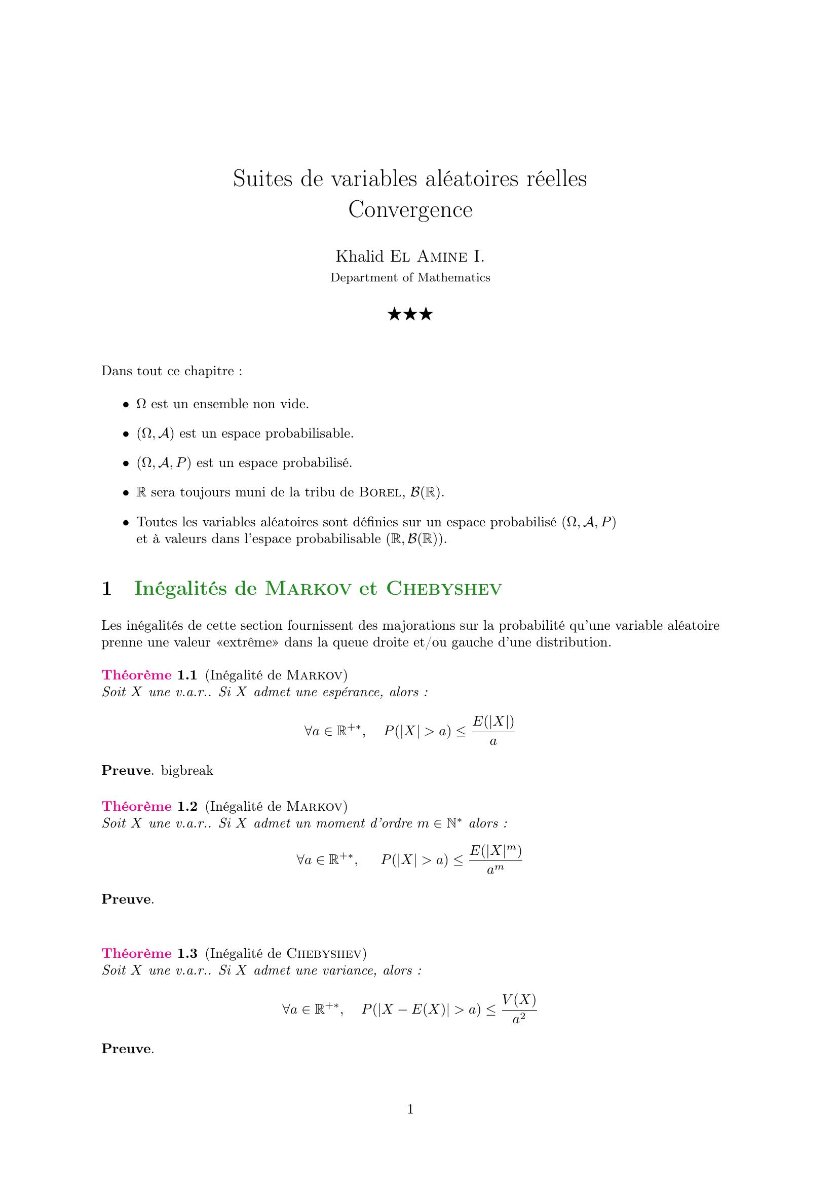 Page 1 : Suites de variables aléatoires réellesConvergenceKhalid El Amine I.Department of MathematicsDans tout ce chapitre :• Ωest un ensemble non vide.• Ω, A est un espace probabilisable.• Ω, A, P est un espace probabilisé.• R sera toujours muni de la tribu de Borel, BR.• Toutes les variables aléatoires sont définies sur un espace probabilisé Ω, A, Pet à valeurs dans l’espace probabilisable R, BR.1Inégalités de Markov et ChebyshevLes inégalités de cette section fournissent des majorations sur la probabilité qu’une variable aléatoireprenne une valeur «extrême» dans la queue droite et/ou gauche d’une distribution.Théorème 1.1 Inégalité de MarkovSoit X une v.a.r.. Si X admet une espérance, alors :a R+,PX a EXaPreuve. bigbreakThéorème 1.2 Inégalité de MarkovSoit X une v.a.r.. Si X admet un moment d’ordre m Nalors :a R+,PX a EXmamPreuve.Théorème 1.3 Inégalité de ChebyshevSoit X une v.a.r.. Si X admet une variance, alors :a R+,PX EX a V Xa2Preuve.1