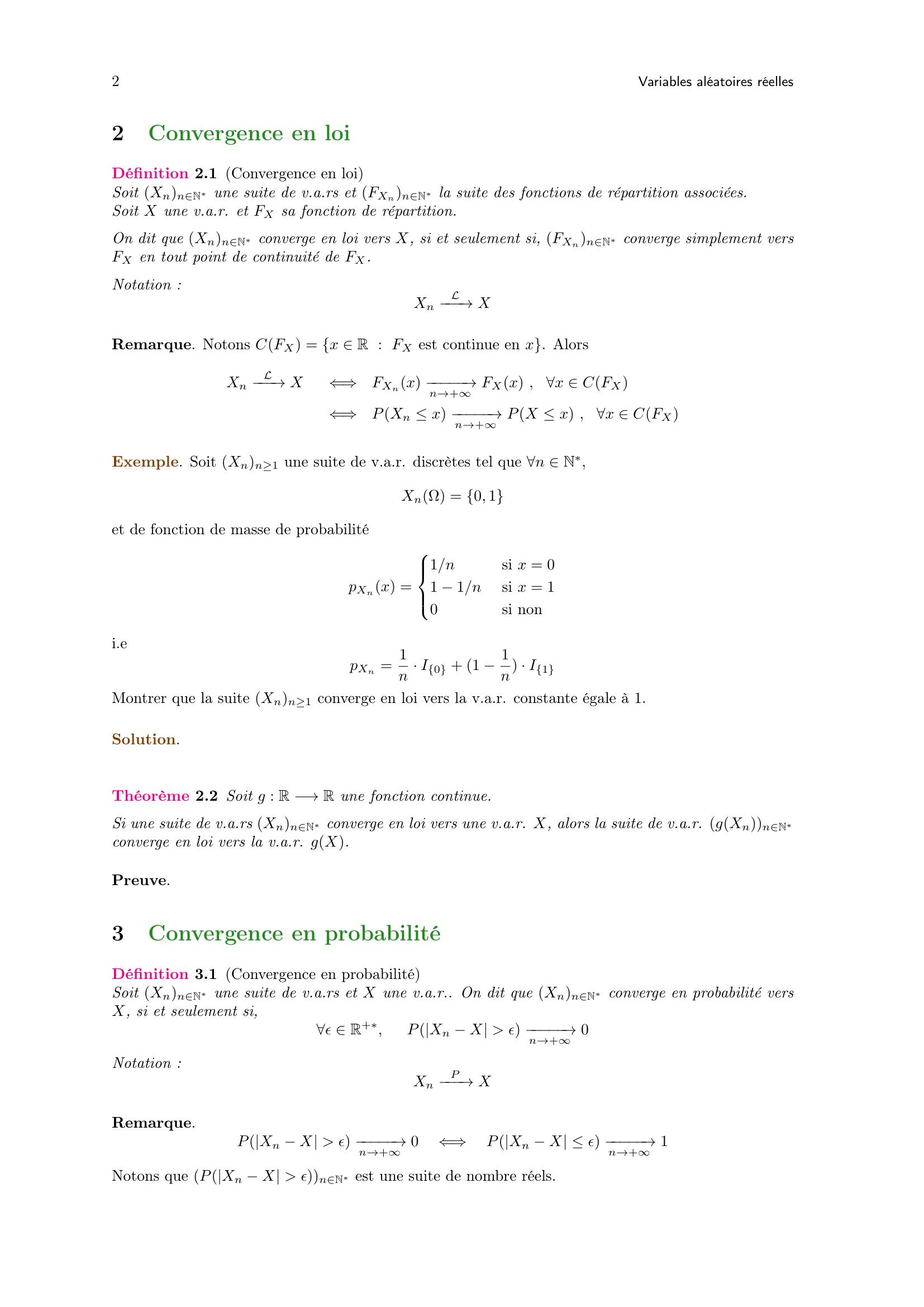 Page 2 : 2Variables aléatoires réelles2Convergence en loiDéfinition 2.1 Convergence en loiSoit XnnNune suite de v.a.rs et FXnnNla suite des fonctions de répartition associées.Soit X une v.a.r. et FX sa fonction de répartition.On dit que XnnNconverge en loi vers X, si et seulement si, FXnnNconverge simplement versFX en tout point de continuité de FX.Notation :XnL→XRemarque. Notons CFX = x R : FX est continue en x. AlorsXnL→X⇐⇒FXnx →n→+FXx ,x CFX⇐⇒PXn x →n→+PX x ,x CFXExemple. Soit Xnn1 une suite de v.a.r. discrètes tel que n N,XnΩ = 0, 1et de fonction de masse de probabilitépXnx =1/nsi x = 01 1/nsi x = 10si noni.epXn = 1n · I0 + 1 1n · I1Montrer que la suite Xnn1 converge en loi vers la v.a.r. constante égale à 1.Solution.Théorème 2.2 Soit g : R →R une fonction continue.Si une suite de v.a.rs XnnNconverge en loi vers une v.a.r. X, alors la suite de v.a.r. gXnnNconverge en loi vers la v.a.r. gX.Preuve.3Convergence en probabilitéDéfinition 3.1 Convergence en probabilitéSoit XnnNune suite de v.a.rs et X une v.a.r.. On dit que XnnNconverge en probabilité versX, si et seulement si,ϵ R+,PXn X ϵ →n→+0Notation :XnP→XRemarque.PXn X ϵ →n→+0⇐⇒PXn X ϵ →n→+1Notons que PXn X ϵnNest une suite de nombre réels.