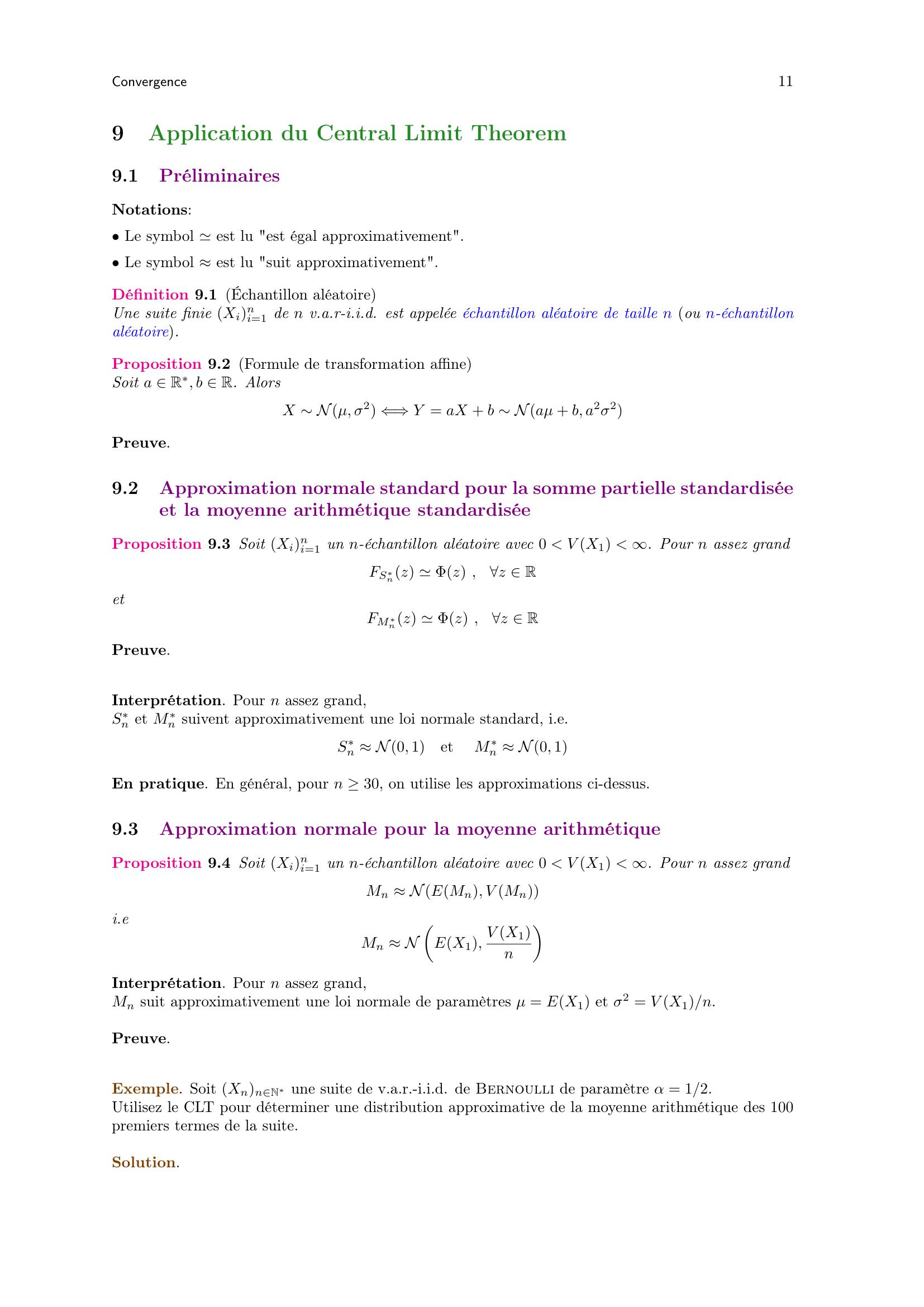 Page 11 : Convergence119Application du Central Limit Theorem9.1PréliminairesNotations:• Le symbol est lu "est égal approximativement".• Le symbol est lu "suit approximativement".Définition 9.1 Échantillon aléatoireUne suite finie Xini=1 de n v.a.r-i.i.d. est appelée échantillon aléatoire de taille n ou n-échantillonaléatoire.Proposition 9.2 Formule de transformation affineSoit a R, b R. AlorsX Nµ, σ2 ⇐⇒Y = aX + b Naµ + b, a2σ2Preuve.9.2Approximation normale standard pour la somme partielle standardiséeet la moyenne arithmétique standardiséeProposition 9.3 Soit Xini=1 un n-échantillon aléatoire avec 0 V X1 . Pour n assez grandFSnz Φz ,z RetFM nz Φz ,z RPreuve.Interprétation. Pour n assez grand,Sn et M n suivent approximativement une loi normale standard, i.e.Sn N0, 1etM n N0, 1En pratique. En général, pour n 30, on utilise les approximations ci-dessus.9.3Approximation normale pour la moyenne arithmétiqueProposition 9.4 Soit Xini=1 un n-échantillon aléatoire avec 0 V X1 . Pour n assez grandMn NEMn, V Mni.eMn NEX1, V X1nInterprétation. Pour n assez grand,Mn suit approximativement une loi normale de paramètres µ = EX1 et σ2 = V X1/n.Preuve.Exemple. Soit XnnNune suite de v.a.r.-i.i.d. de Bernoulli de paramètre α = 1/2.Utilisez le CLT pour déterminer une distribution approximative de la moyenne arithmétique des 100premiers termes de la suite.Solution.