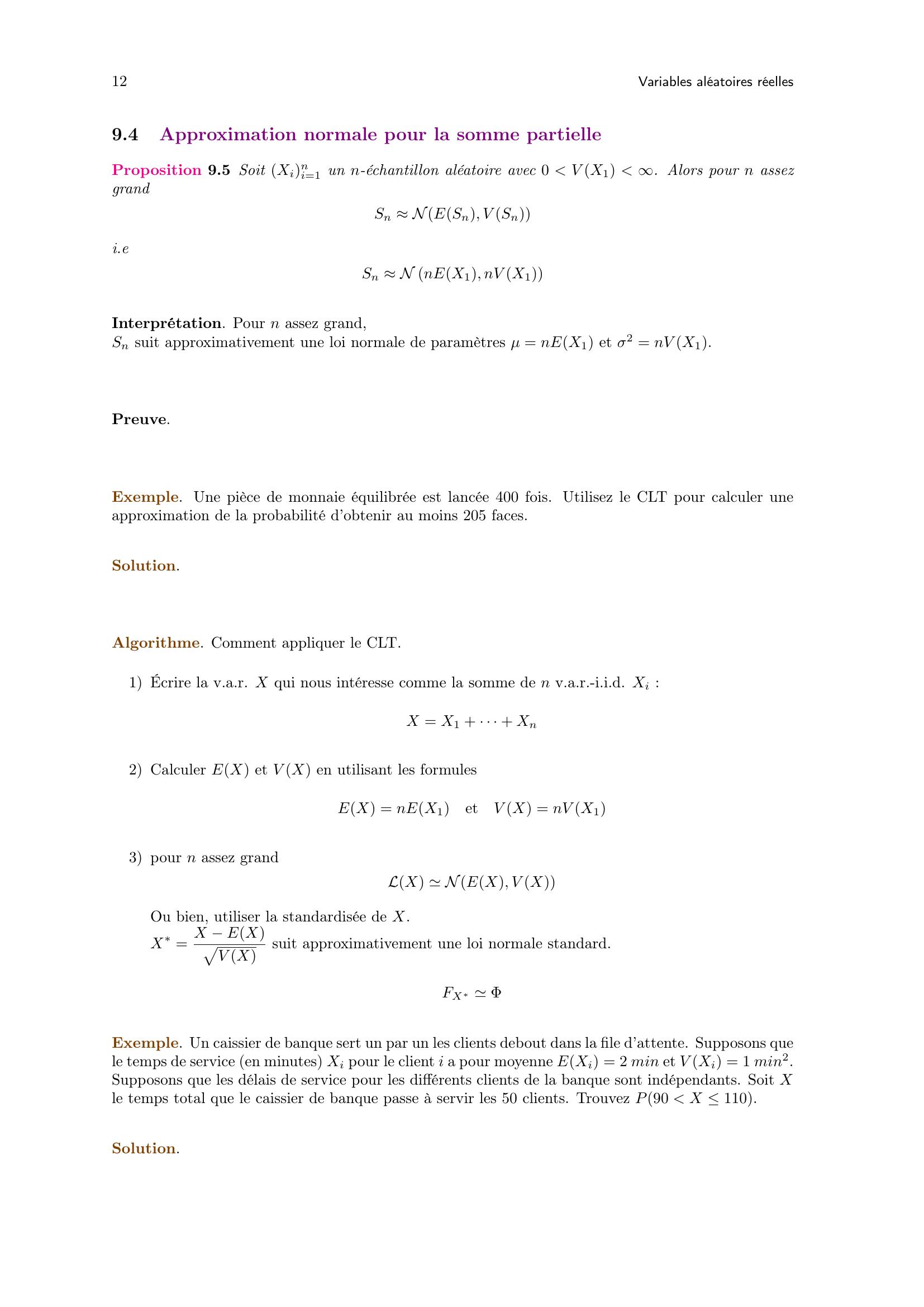 Page 12 : 12Variables aléatoires réelles9.4Approximation normale pour la somme partielleProposition 9.5 Soit Xini=1 un n-échantillon aléatoire avec 0 V X1 . Alors pour n assezgrandSn NESn, V Sni.eSn N nEX1, nV X1Interprétation. Pour n assez grand,Sn suit approximativement une loi normale de paramètres µ = nEX1 et σ2 = nV X1.Preuve.Exemple. Une pièce de monnaie équilibrée est lancée 400 fois. Utilisez le CLT pour calculer uneapproximation de la probabilité d’obtenir au moins 205 faces.Solution.Algorithme. Comment appliquer le CLT.1 Écrire la v.a.r. X qui nous intéresse comme la somme de n v.a.r.-i.i.d. Xi :X = X1 + · · · + Xn2 Calculer EX et V X en utilisant les formulesEX = nEX1etV X = nV X13 pour n assez grandLX NEX, V XOu bien, utiliser la standardisée de X.X= X EXpV Xsuit approximativement une loi normale standard.FXΦExemple. Un caissier de banque sert un par un les clients debout dans la file d’attente. Supposons quele temps de service en minutes Xi pour le client i a pour moyenne EXi = 2 min et V Xi = 1 min2.Supposons que les délais de service pour les différents clients de la banque sont indépendants. Soit Xle temps total que le caissier de banque passe à servir les 50 clients. Trouvez P90 X 110.Solution.
