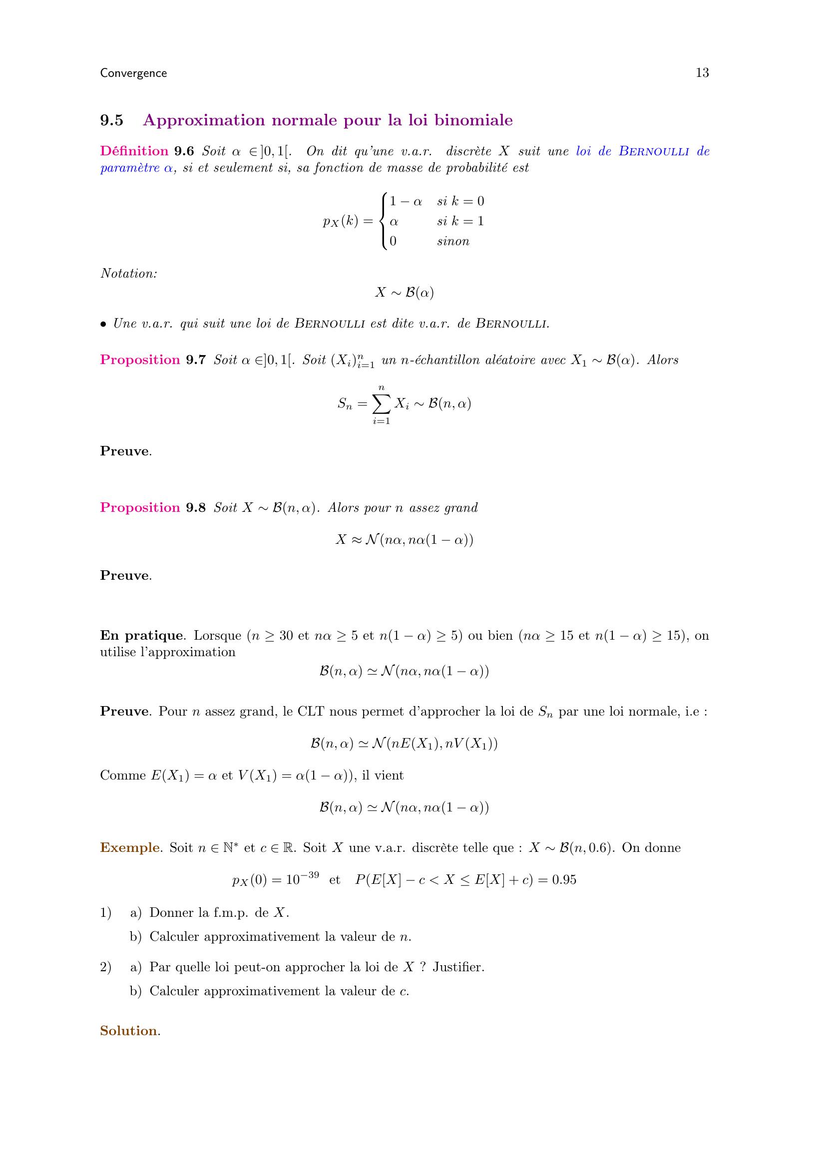 Page 13 : Convergence139.5Approximation normale pour la loi binomialeDéfinition 9.6 Soit α 0, 1.On dit qu’une v.a.r.discrète X suit une loi de Bernoulli deparamètre α, si et seulement si, sa fonction de masse de probabilité estpXk =1 αsi k = 0αsi k = 10sinonNotation:X Bα• Une v.a.r. qui suit une loi de Bernoulli est dite v.a.r. de Bernoulli.Proposition 9.7 Soit α 0, 1. Soit Xini=1 un n-échantillon aléatoire avec X1 Bα. AlorsSn =nXi=1Xi Bn, αPreuve.Proposition 9.8 Soit X Bn, α. Alors pour n assez grandX Nnα, nα1 αPreuve.En pratique. Lorsque n 30 et nα 5 et n1 α 5 ou bien nα 15 et n1 α 15, onutilise l’approximationBn, α Nnα, nα1 αPreuve. Pour n assez grand, le CLT nous permet d’approcher la loi de Sn par une loi normale, i.e :Bn, α NnEX1, nV X1Comme EX1 = α et V X1 = α1 α, il vientBn, α Nnα, nα1 αExemple. Soit n Net c R. Soit X une v.a.r. discrète telle que : X Bn, 0.6. On donnepX0 = 1039 etPEX c X EX + c = 0.951a Donner la f.m.p. de X.b Calculer approximativement la valeur de n.2a Par quelle loi peut-on approcher la loi de X ? Justifier.b Calculer approximativement la valeur de c.Solution.