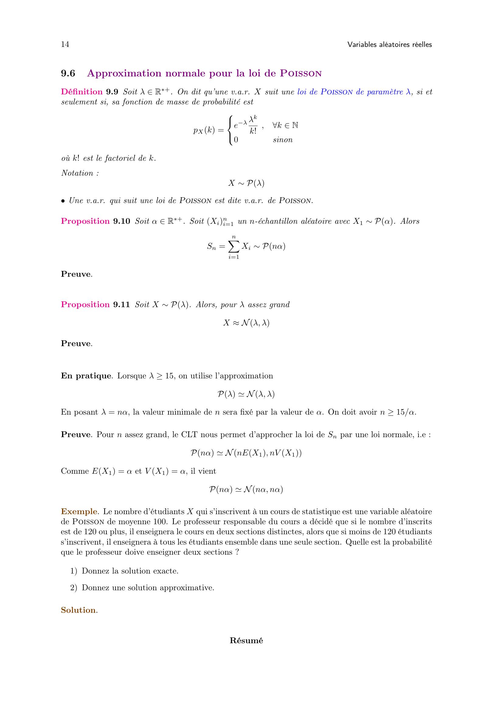 Page 14 : 14Variables aléatoires réelles9.6Approximation normale pour la loi de PoissonDéfinition 9.9 Soit λ R+. On dit qu’une v.a.r. X suit une loi de Poisson de paramètre λ, si etseulement si, sa fonction de masse de probabilité estpXk =eλ λkk! ,k N0sinonoù k! est le factoriel de k.Notation :X Pλ• Une v.a.r. qui suit une loi de Poisson est dite v.a.r. de Poisson.Proposition 9.10 Soit α R+. Soit Xini=1 un n-échantillon aléatoire avec X1 Pα. AlorsSn =nXi=1Xi PnαPreuve.Proposition 9.11 Soit X Pλ. Alors, pour λ assez grandX Nλ, λPreuve.En pratique. Lorsque λ 15, on utilise l’approximationPλ Nλ, λEn posant λ = nα, la valeur minimale de n sera fixé par la valeur de α. On doit avoir n 15/α.Preuve. Pour n assez grand, le CLT nous permet d’approcher la loi de Sn par une loi normale, i.e :Pnα NnEX1, nV X1Comme EX1 = α et V X1 = α, il vientPnα Nnα, nαExemple. Le nombre d’étudiants X qui s’inscrivent à un cours de statistique est une variable aléatoirede Poisson de moyenne 100. Le professeur responsable du cours a décidé que si le nombre d’inscritsest de 120 ou plus, il enseignera le cours en deux sections distinctes, alors que si moins de 120 étudiantss’inscrivent, il enseignera à tous les étudiants ensemble dans une seule section. Quelle est la probabilitéque le professeur doive enseigner deux sections ?1 Donnez la solution exacte.2 Donnez une solution approximative.Solution.Résumé