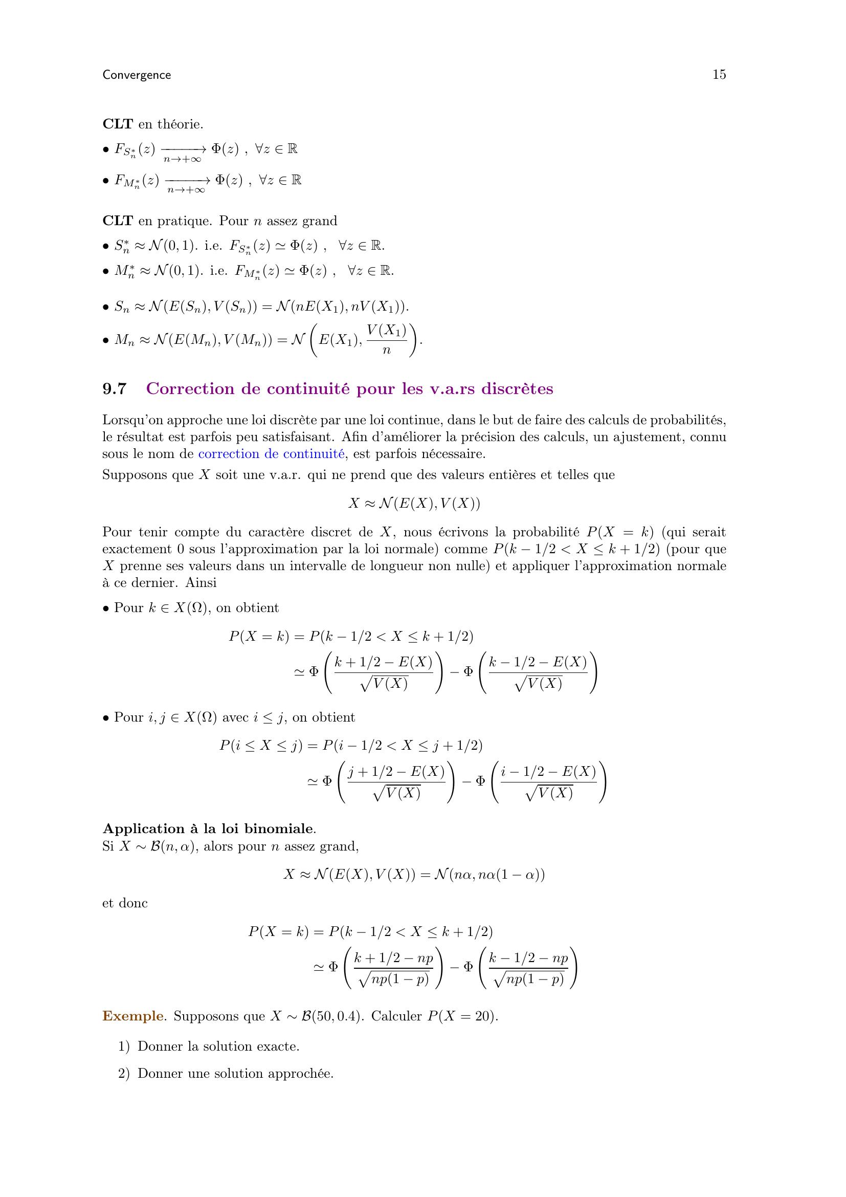 Page 15 : Convergence15CLT en théorie.• FSnz →n→+Φz , z R• FM nz →n→+Φz , z RCLT en pratique. Pour n assez grand• Sn N0, 1. i.e. FSnz Φz ,z R.• M n N0, 1. i.e. FM nz Φz ,z R.• Sn NESn, V Sn = NnEX1, nV X1.• Mn NEMn, V Mn = NEX1, V X1n.9.7Correction de continuité pour les v.a.rs discrètesLorsqu’on approche une loi discrète par une loi continue, dans le but de faire des calculs de probabilités,le résultat est parfois peu satisfaisant. Afin d’améliorer la précision des calculs, un ajustement, connusous le nom de correction de continuité, est parfois nécessaire.Supposons que X soit une v.a.r. qui ne prend que des valeurs entières et telles queX NEX, V XPour tenir compte du caractère discret de X, nous écrivons la probabilité PX = k qui seraitexactement 0 sous l’approximation par la loi normale comme Pk 1/2 X k + 1/2 pour queX prenne ses valeurs dans un intervalle de longueur non nulle et appliquer l’approximation normaleà ce dernier. Ainsi• Pour k XΩ, on obtientPX = k = Pk 1/2 X k + 1/2Φ k + 1/2 EXpV X!Φ k 1/2 EXpV X!• Pour i, j XΩ avec i j, on obtientPi X j = Pi 1/2 X j + 1/2Φ j + 1/2 EXpV X!Φ i 1/2 EXpV X!Application à la loi binomiale.Si X Bn, α, alors pour n assez grand,X NEX, V X = Nnα, nα1 αet doncPX = k = Pk 1/2 X k + 1/2Φ k + 1/2 nppnp1 p!Φ k 1/2 nppnp1 p!Exemple. Supposons que X B50, 0.4. Calculer PX = 20.1 Donner la solution exacte.2 Donner une solution approchée.