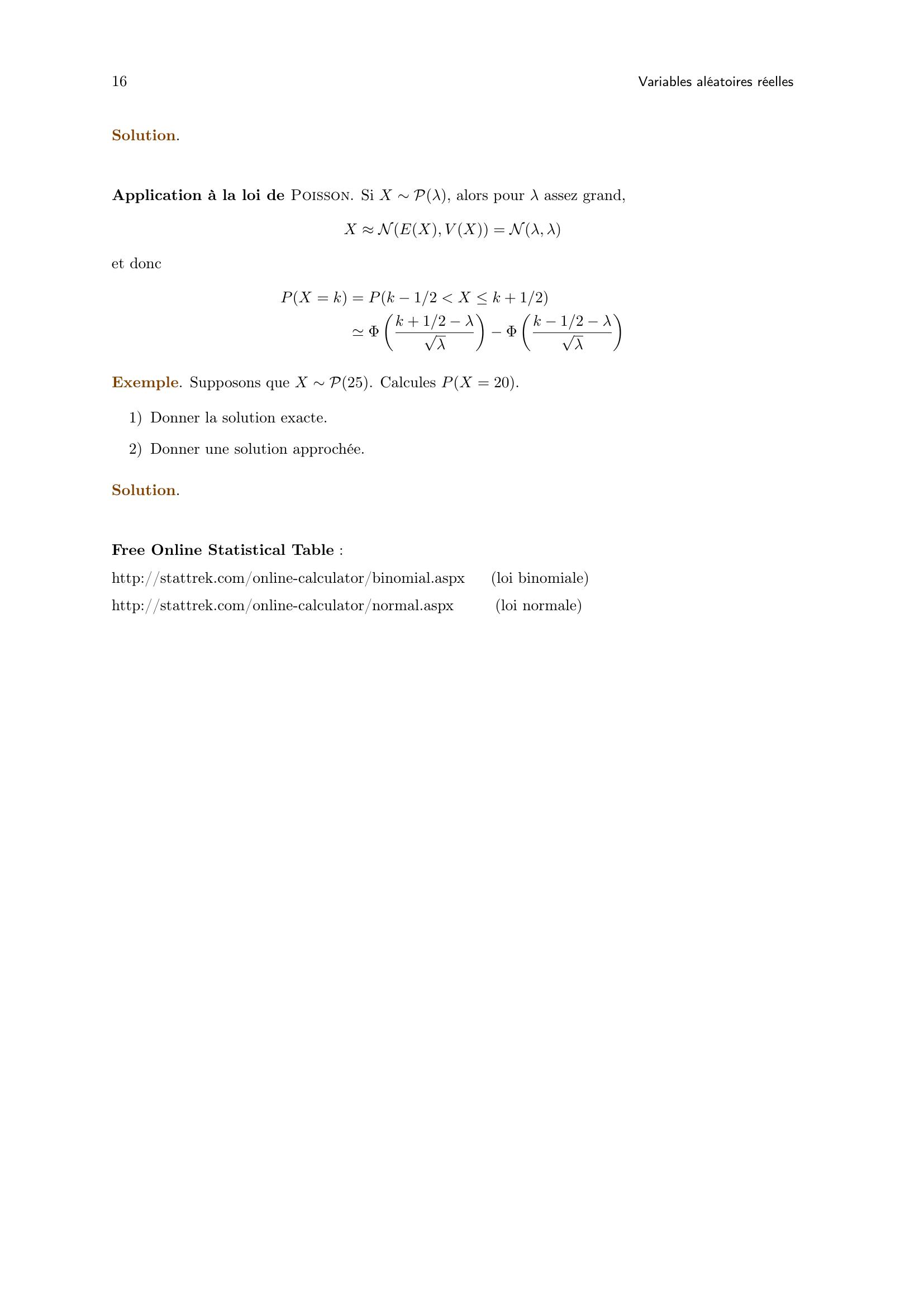 Page 16 : 16Variables aléatoires réellesSolution.Application à la loi de Poisson. Si X Pλ, alors pour λ assez grand,X NEX, V X = Nλ, λet doncPX = k = Pk 1/2 X k + 1/2Φk + 1/2 λλΦk 1/2 λλExemple. Supposons que X P25. Calcules PX = 20.1 Donner la solution exacte.2 Donner une solution approchée.Solution.Free Online Statistical Table :http://stattrek.com/online-calculator/binomial.aspxloi binomialehttp://stattrek.com/online-calculator/normal.aspxloi normale