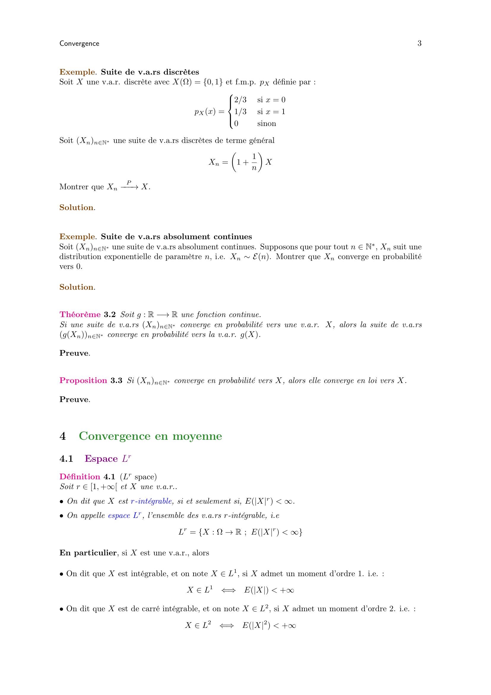 Page 3 : Convergence3Exemple. Suite de v.a.rs discrètesSoit X une v.a.r. discrète avec XΩ = 0, 1 et f.m.p. pX définie par :pXx =2/3si x = 01/3si x = 10sinonSoit XnnNune suite de v.a.rs discrètes de terme généralXn =1 + 1nXMontrer que XnP→X.Solution.Exemple. Suite de v.a.rs absolument continuesSoit XnnNune suite de v.a.rs absolument continues. Supposons que pour tout n N, Xn suit unedistribution exponentielle de paramètre n, i.e. Xn En. Montrer que Xn converge en probabilitévers 0.Solution.Théorème 3.2 Soit g : R →R une fonction continue.Si une suite de v.a.rs XnnNconverge en probabilité vers une v.a.r. X, alors la suite de v.a.rsgXnnNconverge en probabilité vers la v.a.r. gX.Preuve.Proposition 3.3 Si XnnNconverge en probabilité vers X, alors elle converge en loi vers X.Preuve.4Convergence en moyenne4.1Espace LrDéfinition 4.1 Lr spaceSoit r 1, + et X une v.a.r..• On dit que X est r-intégrable, si et seulement si, EXr .• On appelle espace Lr, l’ensemble des v.a.rs r-intégrable, i.eLr = X : Ω→R ; EXr En particulier, si X est une v.a.r., alors• On dit que X est intégrable, et on note X L1, si X admet un moment d’ordre 1. i.e. :X L1⇐⇒EX +• On dit que X est de carré intégrable, et on note X L2, si X admet un moment d’ordre 2. i.e. :X L2⇐⇒EX2 +