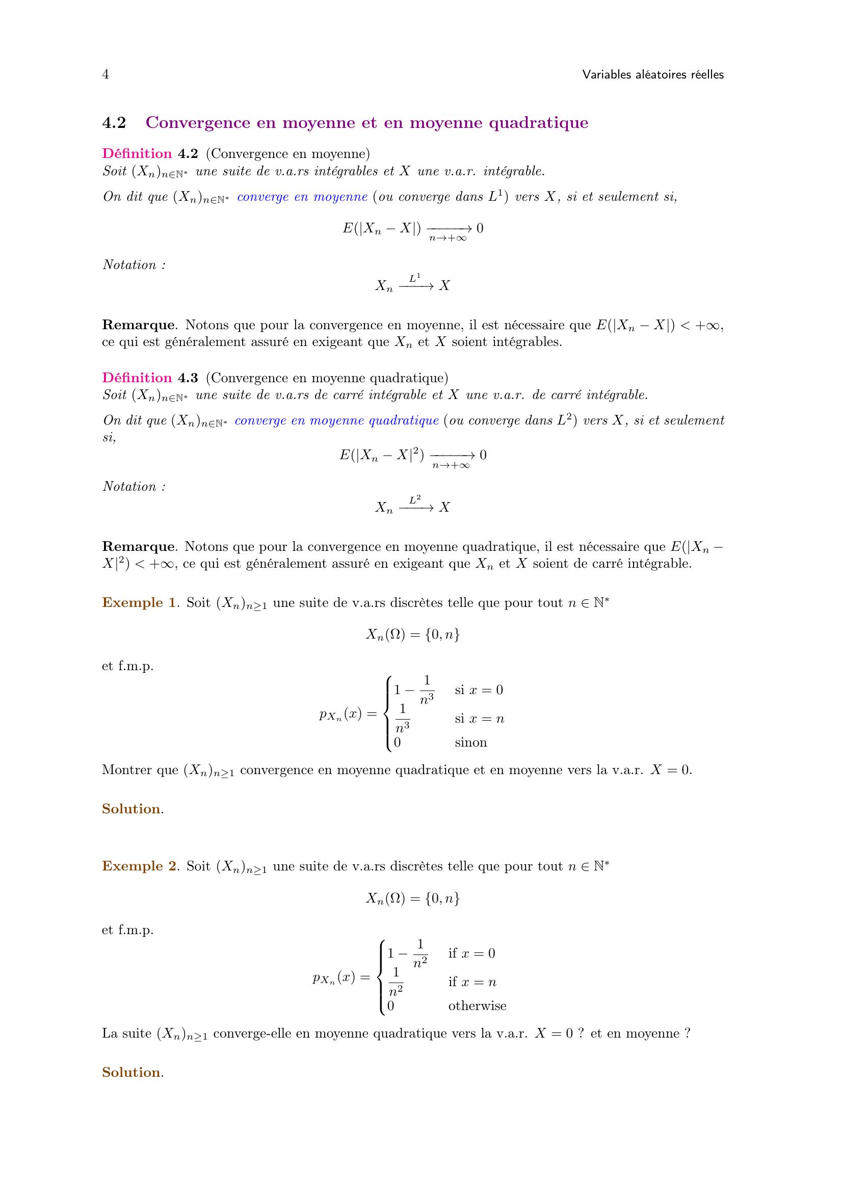 Page 4 : 4Variables aléatoires réelles4.2Convergence en moyenne et en moyenne quadratiqueDéfinition 4.2 Convergence en moyenneSoit XnnNune suite de v.a.rs intégrables et X une v.a.r. intégrable.On dit que XnnNconverge en moyenne ou converge dans L1 vers X, si et seulement si,EXn X →n→+0Notation :XnL1→XRemarque. Notons que pour la convergence en moyenne, il est nécessaire que EXn X +,ce qui est généralement assuré en exigeant que Xn et X soient intégrables.Définition 4.3 Convergence en moyenne quadratiqueSoit XnnNune suite de v.a.rs de carré intégrable et X une v.a.r. de carré intégrable.On dit que XnnNconverge en moyenne quadratique ou converge dans L2 vers X, si et seulementsi,EXn X2 →n→+0Notation :XnL2→XRemarque. Notons que pour la convergence en moyenne quadratique, il est nécessaire que EXn X2 +, ce qui est généralement assuré en exigeant que Xn et X soient de carré intégrable.Exemple 1. Soit Xnn1 une suite de v.a.rs discrètes telle que pour tout n NXnΩ = 0, net f.m.p.pXnx =1 1n3si x = 01n3si x = n0sinonMontrer que Xnn1 convergence en moyenne quadratique et en moyenne vers la v.a.r. X = 0.Solution.Exemple 2. Soit Xnn1 une suite de v.a.rs discrètes telle que pour tout n NXnΩ = 0, net f.m.p.pXnx =1 1n2if x = 01n2if x = n0otherwiseLa suite Xnn1 converge-elle en moyenne quadratique vers la v.a.r. X = 0 ? et en moyenne ?Solution.