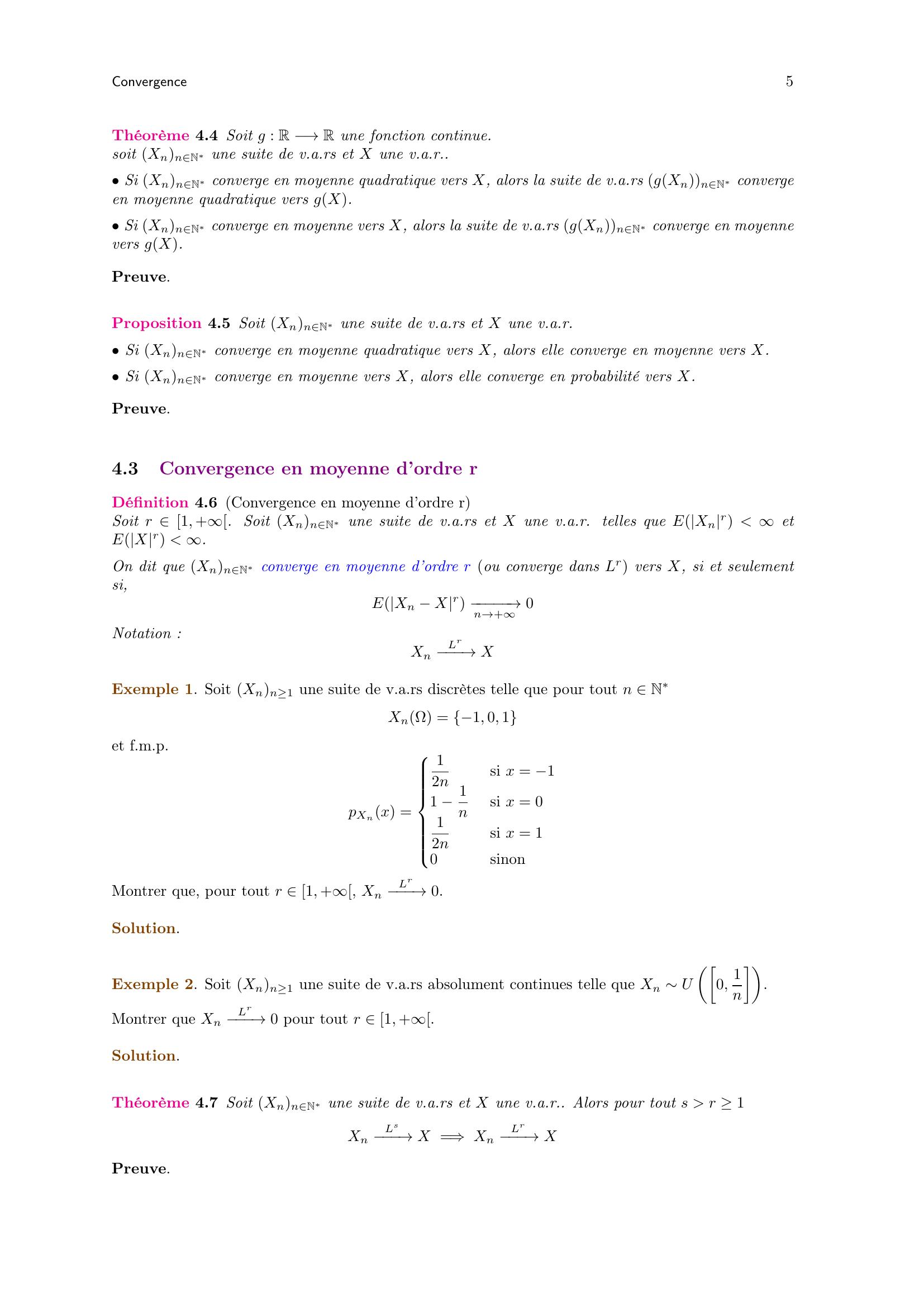Page 5 : Convergence5Théorème 4.4 Soit g : R →R une fonction continue.soit XnnNune suite de v.a.rs et X une v.a.r..• Si XnnNconverge en moyenne quadratique vers X, alors la suite de v.a.rs gXnnNconvergeen moyenne quadratique vers gX.• Si XnnNconverge en moyenne vers X, alors la suite de v.a.rs gXnnNconverge en moyennevers gX.Preuve.Proposition 4.5 Soit XnnNune suite de v.a.rs et X une v.a.r.• Si XnnNconverge en moyenne quadratique vers X, alors elle converge en moyenne vers X.• Si XnnNconverge en moyenne vers X, alors elle converge en probabilité vers X.Preuve.4.3Convergence en moyenne d’ordre rDéfinition 4.6 Convergence en moyenne d’ordre rSoit r 1, +. Soit XnnNune suite de v.a.rs et X une v.a.r. telles que EXnr etEXr .On dit que XnnNconverge en moyenne d’ordre r ou converge dans Lr vers X, si et seulementsi,EXn Xr →n→+0Notation :XnLr→XExemple 1. Soit Xnn1 une suite de v.a.rs discrètes telle que pour tout n NXnΩ = 1, 0, 1et f.m.p.pXnx =12nsi x = 11 1nsi x = 012nsi x = 10sinonMontrer que, pour tout r 1, +, XnLr→0.Solution.Exemple 2. Soit Xnn1 une suite de v.a.rs absolument continues telle que Xn U0, 1n.Montrer que XnLr→0 pour tout r 1, +.Solution.Théorème 4.7 Soit XnnNune suite de v.a.rs et X une v.a.r.. Alors pour tout s r 1XnLs→X =⇒XnLr→XPreuve.