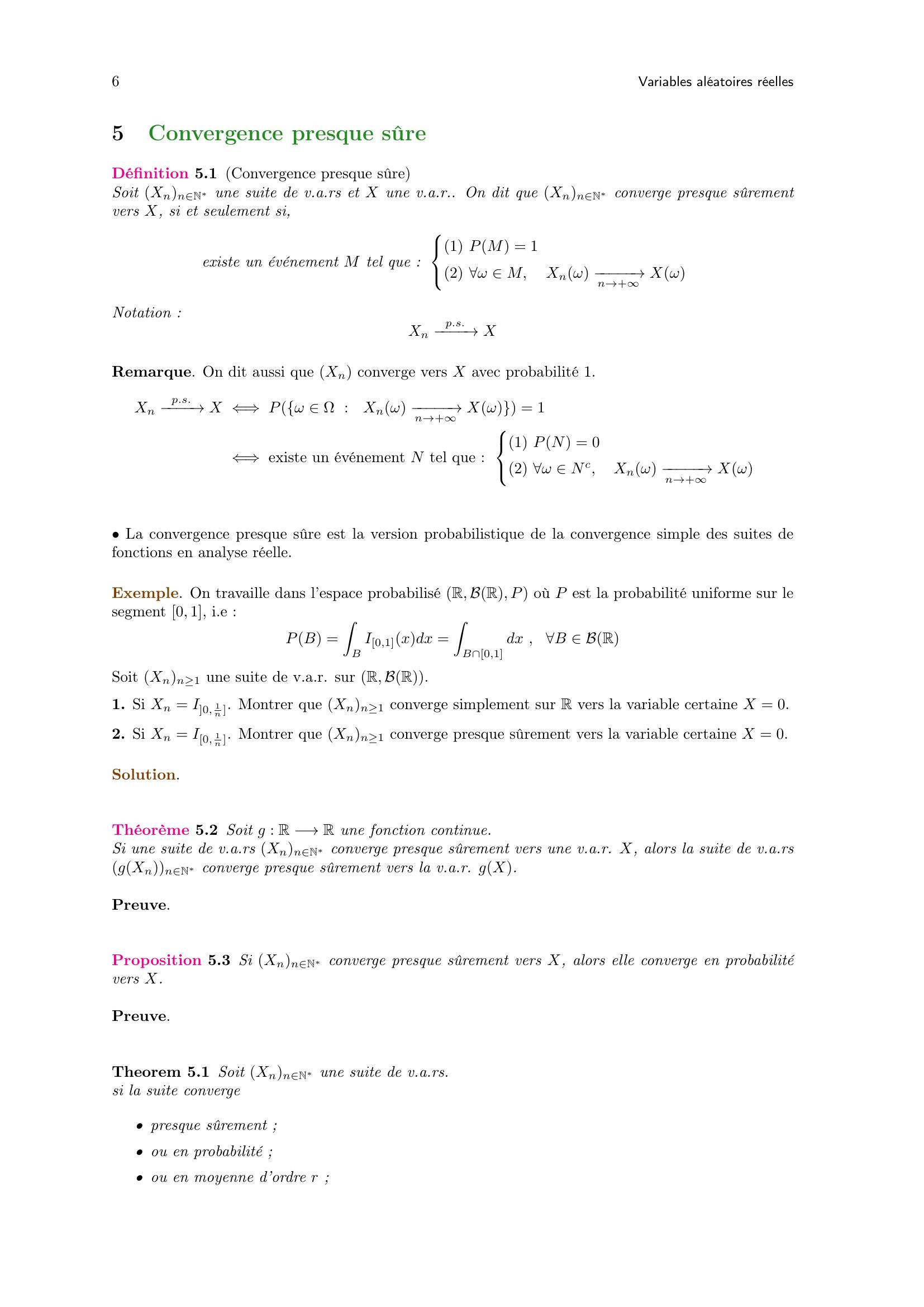 Page 6 : 6Variables aléatoires réelles5Convergence presque sûreDéfinition 5.1 Convergence presque sûreSoit XnnNune suite de v.a.rs et X une v.a.r.. On dit que XnnNconverge presque sûrementvers X, si et seulement si,existe un événement M tel que :1 PM = 12 ω M,Xnω →n→+XωNotation :Xnp.s.→XRemarque. On dit aussi que Xn converge vers X avec probabilité 1.Xnp.s.→X ⇐⇒Pω Ω:Xnω →n→+Xω = 1⇐⇒existe un événement N tel que :1 PN = 02 ω N c,Xnω →n→+Xω• La convergence presque sûre est la version probabilistique de la convergence simple des suites defonctions en analyse réelle.Exemple. On travaille dans l’espace probabilisé R, BR, P où P est la probabilité uniforme sur lesegment 0, 1, i.e :PB =ZBI0,1xdx =ZB0,1dx ,B BRSoit Xnn1 une suite de v.a.r. sur R, BR.1. Si Xn = I0, 1n . Montrer que Xnn1 converge simplement sur R vers la variable certaine X = 0.2. Si Xn = I0, 1n . Montrer que Xnn1 converge presque sûrement vers la variable certaine X = 0.Solution.Théorème 5.2 Soit g : R →R une fonction continue.Si une suite de v.a.rs XnnNconverge presque sûrement vers une v.a.r. X, alors la suite de v.a.rsgXnnNconverge presque sûrement vers la v.a.r. gX.Preuve.Proposition 5.3 Si XnnNconverge presque sûrement vers X, alors elle converge en probabilitévers X.Preuve.Theorem 5.1 Soit XnnNune suite de v.a.rs.si la suite converge• presque sûrement ;• ou en probabilité ;• ou en moyenne d’ordre r ;
