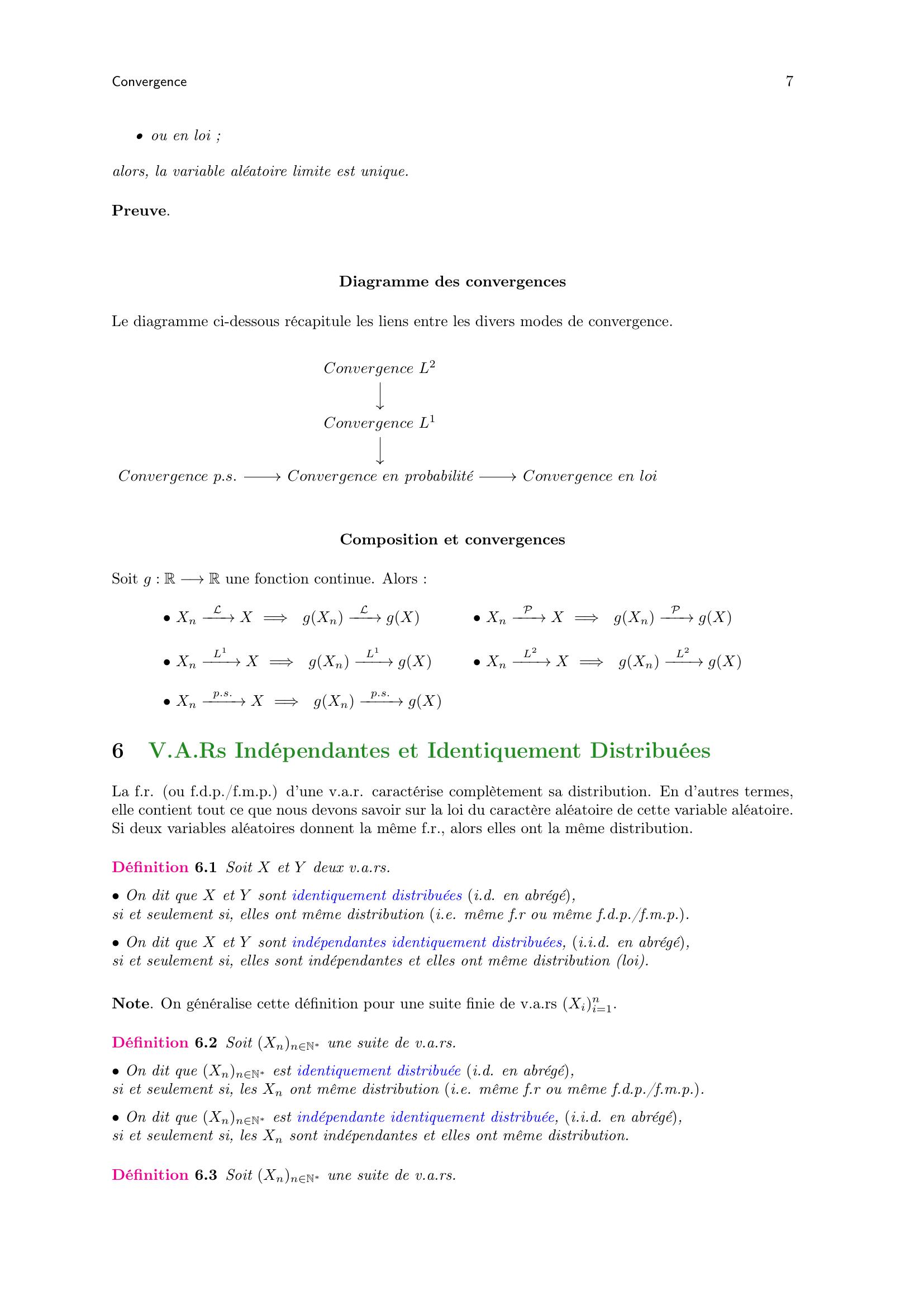 Page 7 : Convergence7• ou en loi ;alors, la variable aléatoire limite est unique.Preuve.Diagramme des convergencesLe diagramme ci-dessous récapitule les liens entre les divers modes de convergence.Convergence L2Convergence L1Convergence p.s.Convergence en probabilitéConvergence en loiComposition et convergencesSoit g : R →R une fonction continue. Alors :• XnL→X =⇒gXnL→gX• XnP→X =⇒gXnP→gX• XnL1→X =⇒gXnL1→gX• XnL2→X =⇒gXnL2→gX• Xnp.s.→X =⇒gXnp.s.→gX6V.A.Rs Indépendantes et Identiquement DistribuéesLa f.r. ou f.d.p./f.m.p. d’une v.a.r. caractérise complètement sa distribution. En d’autres termes,elle contient tout ce que nous devons savoir sur la loi du caractère aléatoire de cette variable aléatoire.Si deux variables aléatoires donnent la même f.r., alors elles ont la même distribution.Définition 6.1 Soit X et Y deux v.a.rs.• On dit que X et Y sont identiquement distribuées i.d. en abrégé,si et seulement si, elles ont même distribution i.e. même f.r ou même f.d.p./f.m.p..• On dit que X et Y sont indépendantes identiquement distribuées, i.i.d. en abrégé,si et seulement si, elles sont indépendantes et elles ont même distribution loi.Note. On généralise cette définition pour une suite finie de v.a.rs Xini=1.Définition 6.2 Soit XnnNune suite de v.a.rs.• On dit que XnnNest identiquement distribuée i.d. en abrégé,si et seulement si, les Xn ont même distribution i.e. même f.r ou même f.d.p./f.m.p..• On dit que XnnNest indépendante identiquement distribuée, i.i.d. en abrégé,si et seulement si, les Xn sont indépendantes et elles ont même distribution.Définition 6.3 Soit XnnNune suite de v.a.rs.