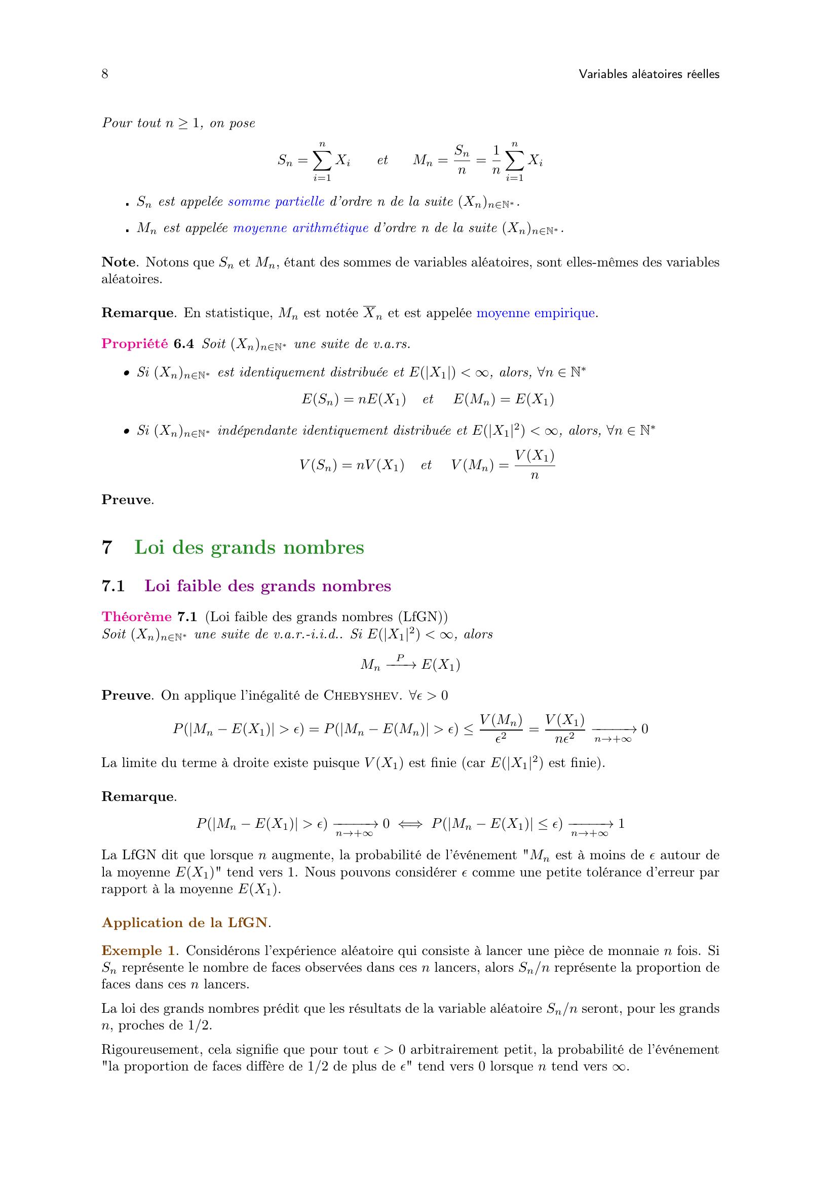 Page 8 : 8Variables aléatoires réellesPour tout n 1, on poseSn =nXi=1XietMn = Snn = 1nnXi=1Xi Sn est appelée somme partielle d’ordre n de la suite XnnN. Mn est appelée moyenne arithmétique d’ordre n de la suite XnnN.Note. Notons que Sn et Mn, étant des sommes de variables aléatoires, sont elles-mêmes des variablesaléatoires.Remarque. En statistique, Mn est notée Xn et est appelée moyenne empirique.Propriété 6.4 Soit XnnNune suite de v.a.rs.• Si XnnNest identiquement distribuée et EX1 , alors, n NESn = nEX1etEMn = EX1• Si XnnNindépendante identiquement distribuée et EX12 , alors, n NV Sn = nV X1etV Mn = V X1nPreuve.7Loi des grands nombres7.1Loi faible des grands nombresThéorème 7.1 Loi faible des grands nombres LfGNSoit XnnNune suite de v.a.r.-i.i.d.. Si EX12 , alorsMnP→EX1Preuve. On applique l’inégalité de Chebyshev. ϵ 0PMn EX1 ϵ = PMn EMn ϵ V Mnϵ2= V X1nϵ2→n→+0La limite du terme à droite existe puisque V X1 est finie car EX12 est finie.Remarque.PMn EX1 ϵ →n→+0 ⇐⇒PMn EX1 ϵ →n→+1La LfGN dit que lorsque n augmente, la probabilité de l’événement "Mn est à moins de ϵ autour dela moyenne EX1" tend vers 1. Nous pouvons considérer ϵ comme une petite tolérance d’erreur parrapport à la moyenne EX1.Application de la LfGN.Exemple 1. Considérons l’expérience aléatoire qui consiste à lancer une pièce de monnaie n fois. SiSn représente le nombre de faces observées dans ces n lancers, alors Sn/n représente la proportion defaces dans ces n lancers.La loi des grands nombres prédit que les résultats de la variable aléatoire Sn/n seront, pour les grandsn, proches de 1/2.Rigoureusement, cela signifie que pour tout ϵ 0 arbitrairement petit, la probabilité de l’événement"la proportion de faces diffère de 1/2 de plus de ϵ" tend vers 0 lorsque n tend vers .
