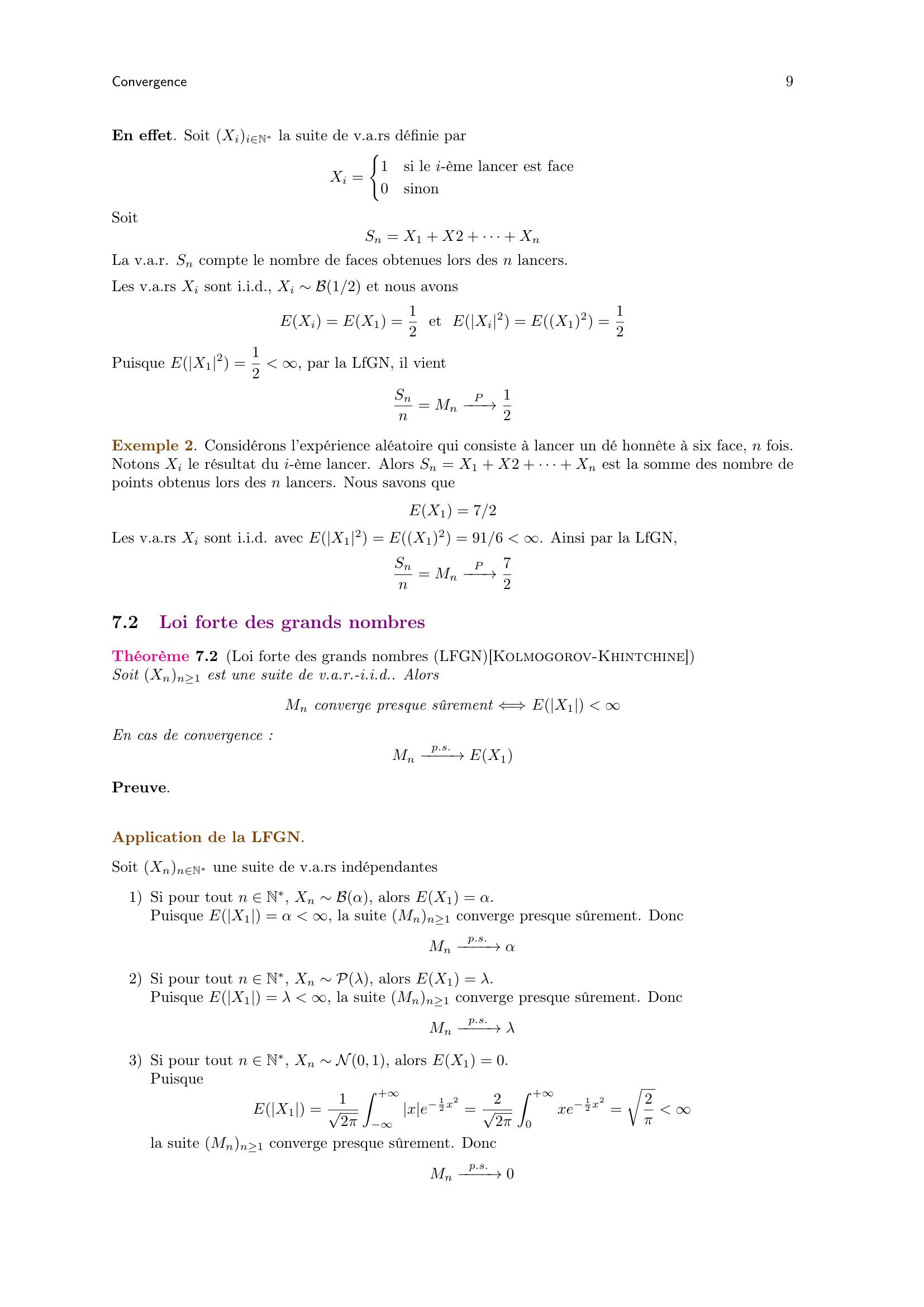 Page 9 : Convergence9En effet. Soit XiiNla suite de v.a.rs définie parXi =1si le i-ème lancer est face0sinonSoitSn = X1 + X2 + · · · + XnLa v.a.r. Sn compte le nombre de faces obtenues lors des n lancers.Les v.a.rs Xi sont i.i.d., Xi B1/2 et nous avonsEXi = EX1 = 12 et EXi2 = EX12 = 12Puisque EX12 = 12 , par la LfGN, il vientSnn = MnP→12Exemple 2. Considérons l’expérience aléatoire qui consiste à lancer un dé honnête à six face, n fois.Notons Xi le résultat du i-ème lancer. Alors Sn = X1 + X2 + · · · + Xn est la somme des nombre depoints obtenus lors des n lancers. Nous savons queEX1 = 7/2Les v.a.rs Xi sont i.i.d. avec EX12 = EX12 = 91/6 . Ainsi par la LfGN,Snn = MnP→727.2Loi forte des grands nombresThéorème 7.2 Loi forte des grands nombres LFGNKolmogorov-KhintchineSoit Xnn1 est une suite de v.a.r.-i.i.d.. AlorsMn converge presque sûrement ⇐⇒EX1 En cas de convergence :Mnp.s.→EX1Preuve.Application de la LFGN.Soit XnnNune suite de v.a.rs indépendantes1 Si pour tout n N, Xn Bα, alors EX1 = α.Puisque EX1 = α , la suite Mnn1 converge presque sûrement. DoncMnp.s.→α2 Si pour tout n N, Xn Pλ, alors EX1 = λ.Puisque EX1 = λ , la suite Mnn1 converge presque sûrement. DoncMnp.s.→λ3 Si pour tout n N, Xn N0, 1, alors EX1 = 0.PuisqueEX1 =12πZ +xe12 x2 =22πZ +0xe12 x2 =r2π la suite Mnn1 converge presque sûrement. DoncMnp.s.→0