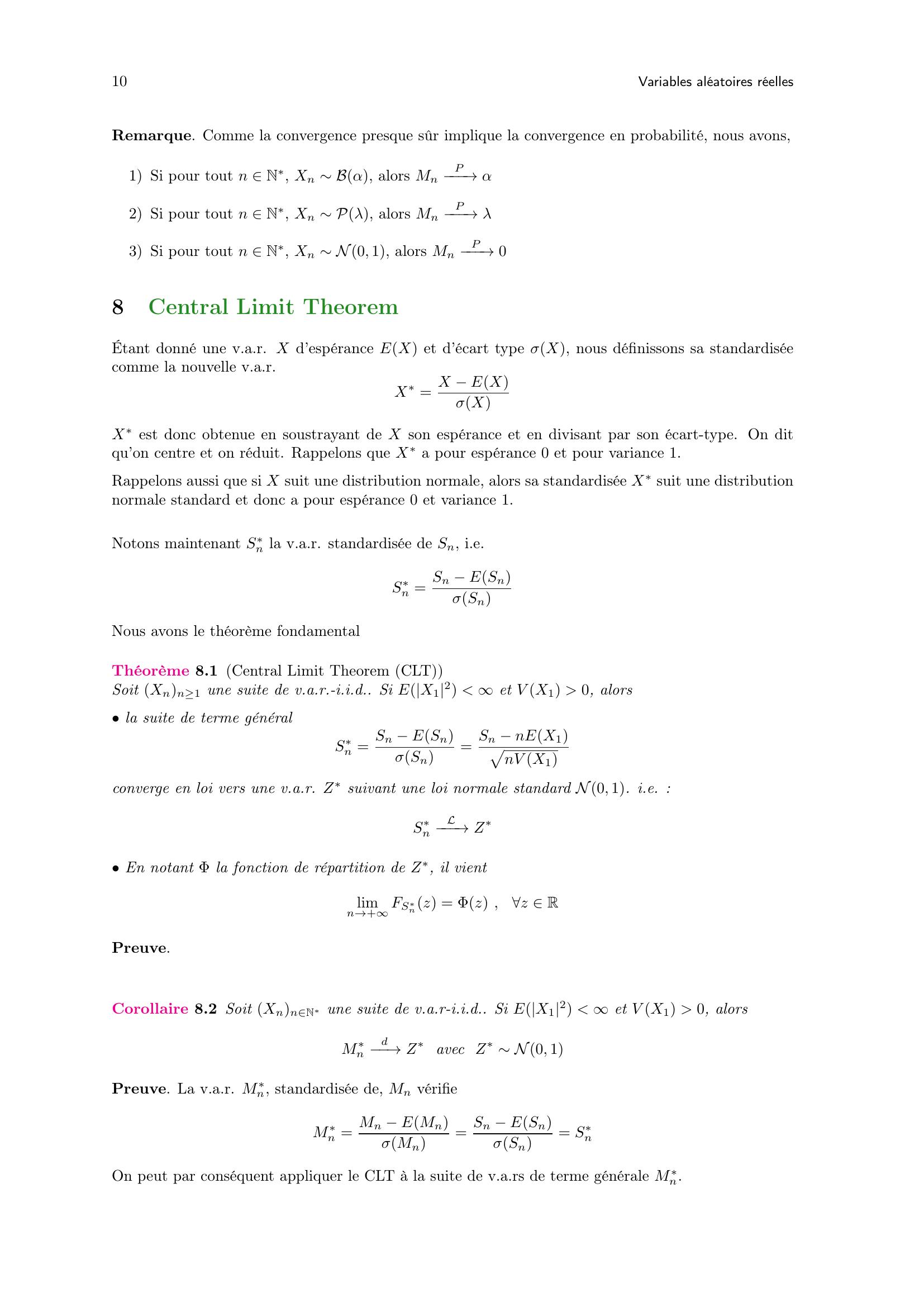 Page 10 : 10Variables aléatoires réellesRemarque. Comme la convergence presque sûr implique la convergence en probabilité, nous avons,1 Si pour tout n N, Xn Bα, alors MnP→α2 Si pour tout n N, Xn Pλ, alors MnP→λ3 Si pour tout n N, Xn N0, 1, alors MnP→08Central Limit TheoremÉtant donné une v.a.r. X d’espérance EX et d’écart type σX, nous définissons sa standardiséecomme la nouvelle v.a.r.X= X EXσXXest donc obtenue en soustrayant de X son espérance et en divisant par son écart-type. On ditqu’on centre et on réduit. Rappelons que Xa pour espérance 0 et pour variance 1.Rappelons aussi que si X suit une distribution normale, alors sa standardisée Xsuit une distributionnormale standard et donc a pour espérance 0 et variance 1.Notons maintenant Sn la v.a.r. standardisée de Sn, i.e.Sn = Sn ESnσSnNous avons le théorème fondamentalThéorème 8.1 Central Limit Theorem CLTSoit Xnn1 une suite de v.a.r.-i.i.d.. Si EX12 et V X1 0, alors• la suite de terme généralSn = Sn ESnσSn= Sn nEX1pnV X1converge en loi vers une v.a.r. Zsuivant une loi normale standard N0, 1. i.e. :SnL→Z• En notant Φ la fonction de répartition de Z, il vientlimn→+FSnz = Φz ,z RPreuve.Corollaire 8.2 Soit XnnNune suite de v.a.r-i.i.d.. Si EX12 et V X1 0, alorsM nd→Zavec ZN0, 1Preuve. La v.a.r. M n, standardisée de, Mn vérifieM n = Mn EMnσMn= Sn ESnσSn= SnOn peut par conséquent appliquer le CLT à la suite de v.a.rs de terme générale M n.