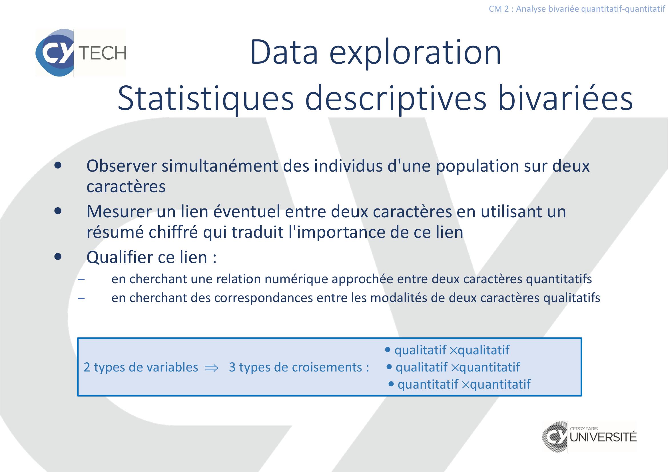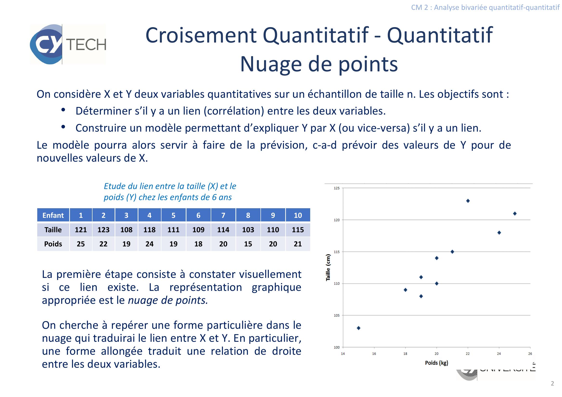Page 1 : CM 2 : Analyse bivariée quantitatif-quantitatifData explorationStatistiques descriptives bivariéesObserver simultanément des individus d'une population sur deux caractèresMesurer un lien éventuel entre deux caractères en utilisant un résumé chiffré qui traduit l'importance de ce lienQualifier ce lien : –en cherchant une relation numérique approchée entre deux caractères quantitatifs–en cherchant des correspondances entre les modalités de deux caractères qualitatifs• qualitatif ×qualitatif2 types de variables 3 types de croisements : • qualitatif ×quantitatif• quantitatif ×quantitatif