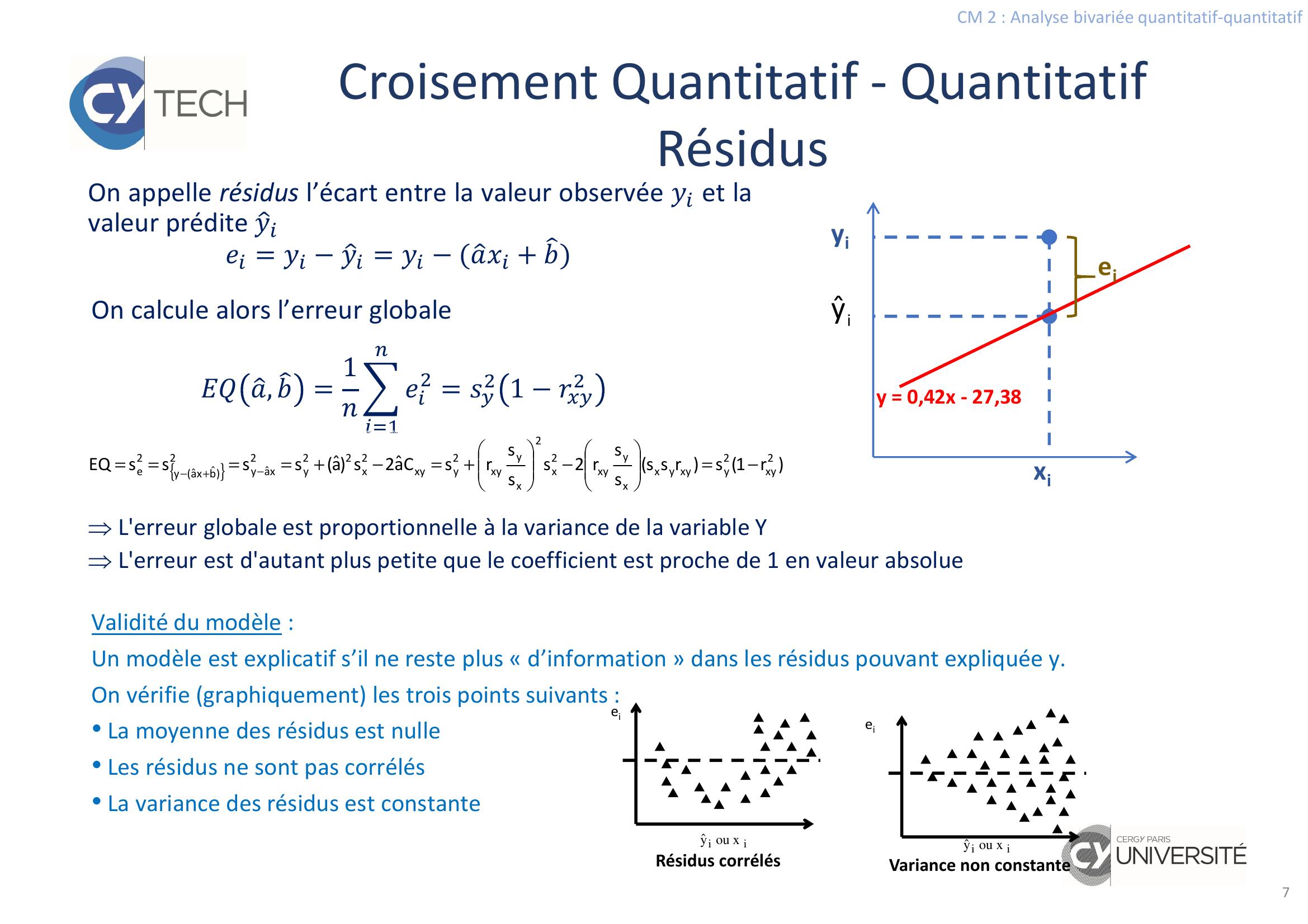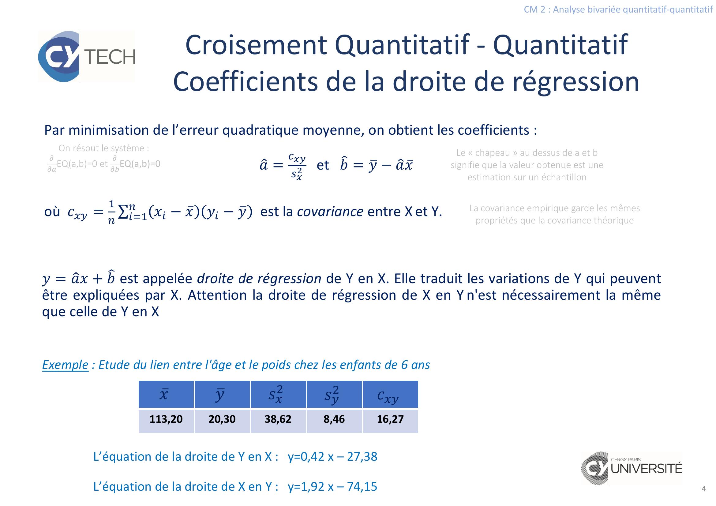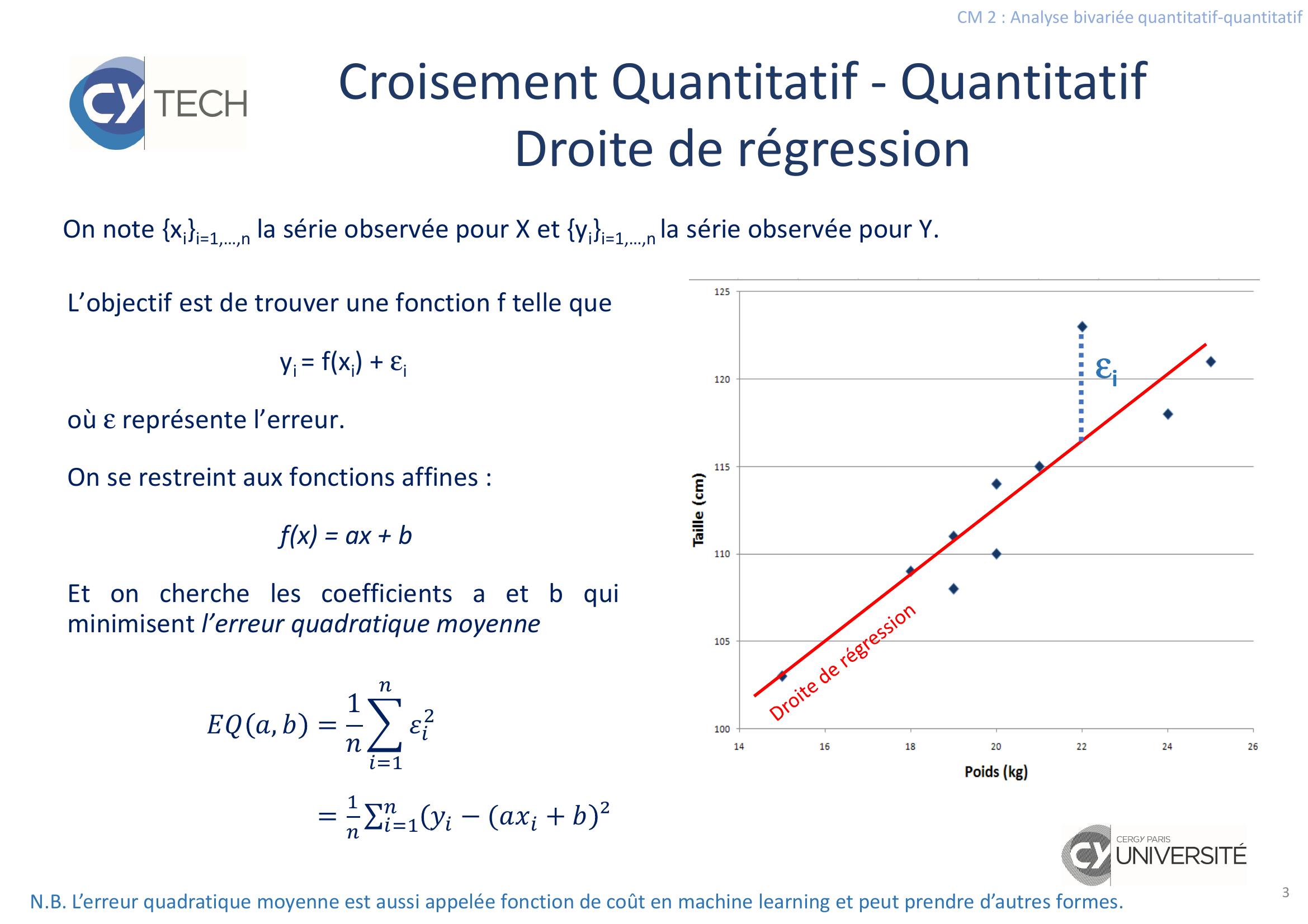 Page 3 : CM 2 : Analyse bivariée quantitatif-quantitatifCroisement Quantitatif - QuantitatifDroite de régression3On note xii=1,…,n la série observée pour X et yii=1,…,nla série observée pour Y.L’objectif est de trouver une fonction f telle queyi = fxi + εioù ε représente l’erreur.On se restreint aux fonctions affines : fx = ax + bEt on cherche les coefficients a et b quiminimisent l’erreur quadratique moyenne , = 1 = + ²εiN.B. L’erreur quadratique moyenne est aussi appelée fonction de coût en machine learning et peut prendre d’autres formes.