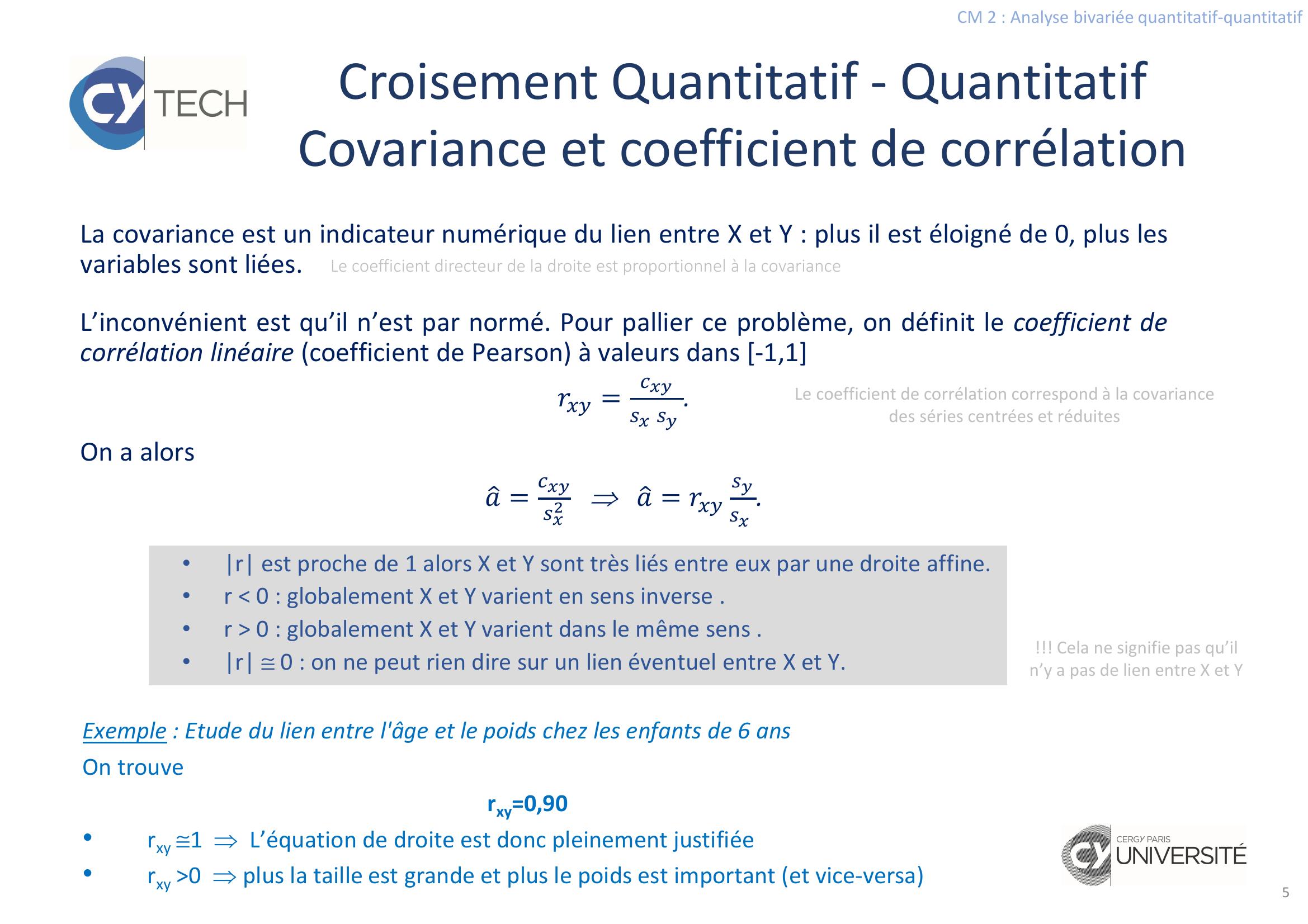 Page 5 : CM 2 : Analyse bivariée quantitatif-quantitatif5Croisement Quantitatif - QuantitatifCovariance et coefficient de corrélation•r est proche de 1 alors X et Y sont très liés entre eux par une droite affine.•r 0 : globalement X et Y varient en sens inverse .•r 0 : globalement X et Y varient dans le même sens .•r 0 : on ne peut rien dire sur un lien éventuel entre X et Y.La covariance est un indicateur numérique du lien entre X et Y : plus il est éloigné de 0, plus lesvariables sont liées.L’inconvénient est qu’il n’est par normé. Pour pallier ce problème, on définit le coefficient decorrélation linéaire coefficient de Pearson à valeurs dans -1,1'!" = .On a alors = = '!" .Le coefficient de corrélation correspond à la covariance des séries centrées et réduites Exemple : Etude du lien entre l'âge et le poids chez les enfants de 6 ansOn trouverxy=0,90•rxy 1 L’équation de droite est donc pleinement justifiée •rxy 0 plus la taille est grande et plus le poids est important et vice-versaLe coefficient directeur de la droite est proportionnel à la covariance!!! Cela ne signifie pas qu’il n’y a pas de lien entre X et Y