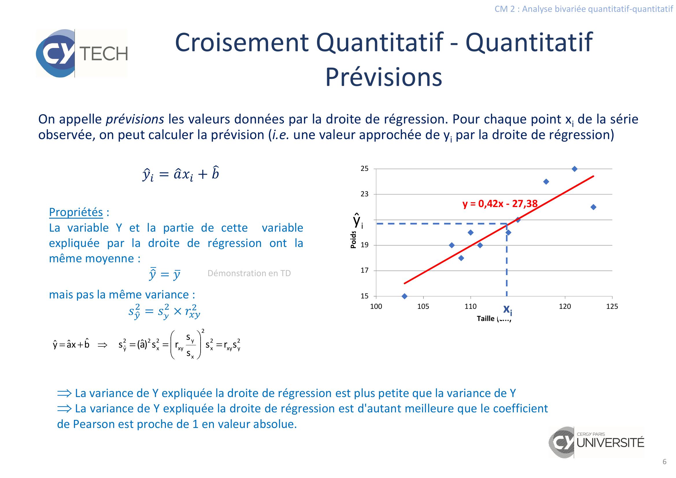 Page 6 : CM 2 : Analyse bivariée quantitatif-quantitatif6On appelle prévisions les valeurs données par la droite de régression. Pour chaque point xi de la sérieobservée, on peut calculer la prévision i.e. une valeur approchée de yi par la droite de régression = + Propriétés :La variable Y et la partie de cettevariableexpliquée par la droite de régression ont lamême moyenne : = mais pas la même variance :" = " × '!"La variance de Y expliquée la droite de régression est plus petite que la variance de YLa variance de Y expliquée la droite de régression est d'autant meilleure que le coefficientde Pearson est proche de 1 en valeur absolue.+=bˆxaˆyˆ2yxy2x2xyxy2x22yˆsrsssrsaˆs===y = 0,42x - 27,38151719212325100105110115120125Poids kgTaille cmxiiyˆDémonstration en TDCroisement Quantitatif - QuantitatifPrévisions