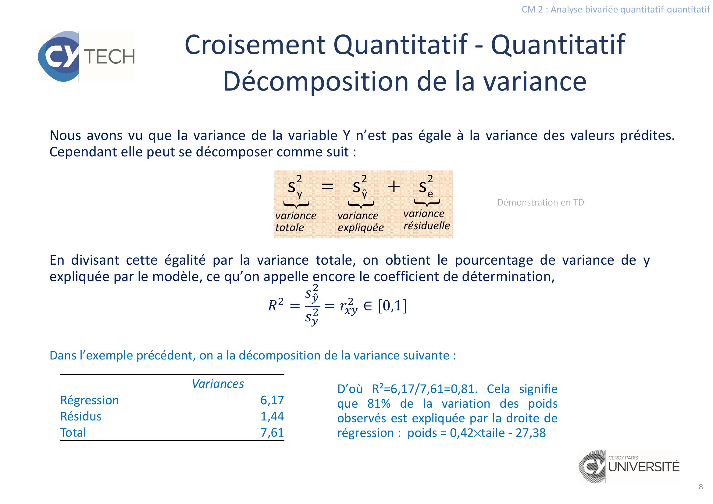 Page 8 : CM 2 : Analyse bivariée quantitatif-quantitatif8Croisement Quantitatif - QuantitatifDécomposition de la variancerésiduelle varianceexpliquéevariancetotalevariance2e2yˆ2ysss+=Nous avons vu que la variance de la variable Y n’est pas égale à la variance des valeurs prédites.Cependant elle peut se décomposer comme suit :En divisant cette égalité par la variance totale, on obtient le pourcentage de variance de yexpliquée par le modèle, ce qu’on appelle encore le coefficient de détermination,+ ="" = '!" 0,1Dans l’exemple précédent, on a la décomposition de la variance suivante :VariancesRégression6,17Résidus1,44Total7,61D’où R²=6,17/7,61=0,81. Cela signifieque 81 de la variation des poidsobservés est expliquée par la droite derégression : poids = 0,42×taile - 27,38Démonstration en TD