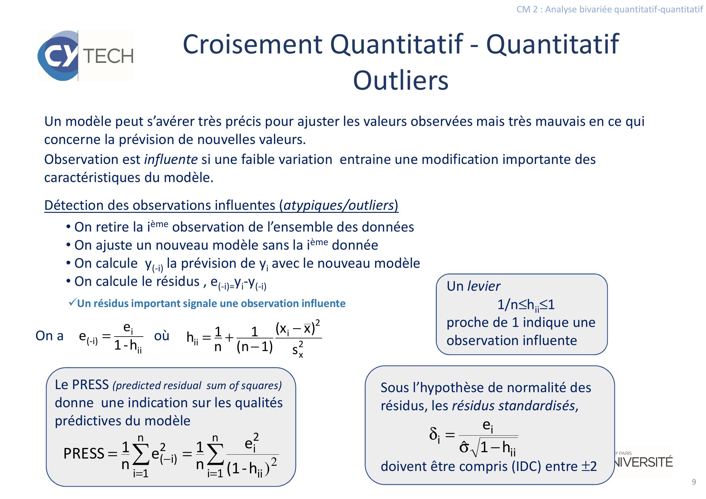 Page 9 : CM 2 : Analyse bivariée quantitatif-quantitatif9Croisement Quantitatif - QuantitatifOutliers9Un modèle peut s’avérer très précis pour ajuster les valeurs observées mais très mauvais en ce qui concerne la prévision de nouvelles valeurs.Détection des observations influentes atypiques/outliers• On retire la ième observation de l’ensemble des données• On ajuste un nouveau modèle sans la ième donnée• On calcule y-i la prévision de yi avec le nouveau modèle• On calcule le résidus , e-i=yi-y-iOn a oùObservation est influente si une faible variation entraine une modification importante des caractéristiques du modèle.iii-ih-1ee=====n1iii2in1i2ih-1en1en1PRESS2Le PRESS predicted residual sum of squares donne une indication sur les qualités prédictives du modèleSous l’hypothèse de normalité des résidus, les résidus standardisés,doivent être compris IDC entre ±2iiiih1eσ=δˆ2x2iiisxx1n1n1h+=Un résidus important signale une observation influenteUn levier1/nhii1proche de 1 indique une observation influente