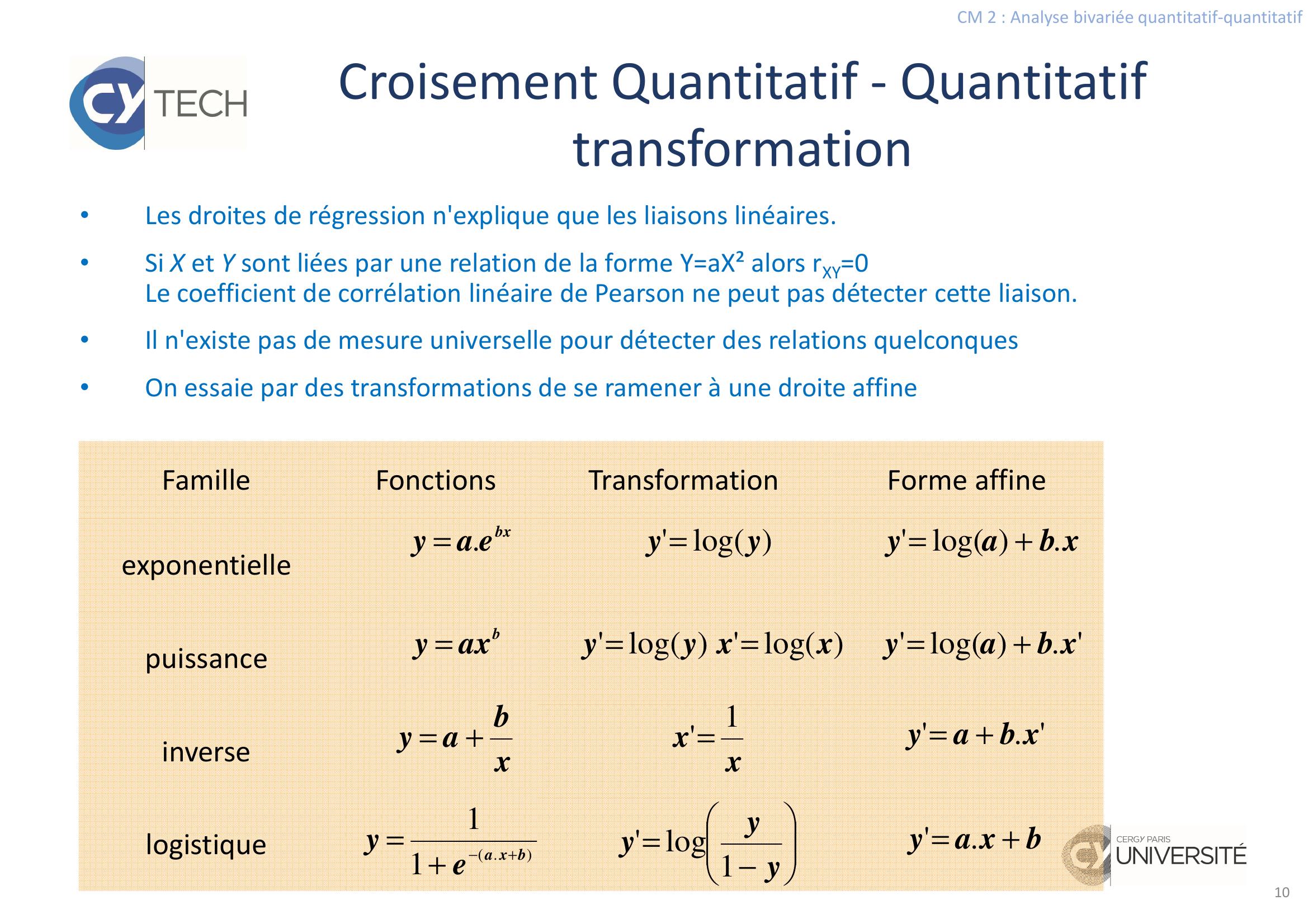 Page 10 : CM 2 : Analyse bivariée quantitatif-quantitatif10Croisement Quantitatif - Quantitatiftransformation•Les droites de régression n'explique que les liaisons linéaires.•Si X et Y sont liées par une relation de la forme Y=aX² alors rXY=0Le coefficient de corrélation linéaire de Pearson ne peut pas détecter cette liaison.•Il n'existe pas de mesure universelle pour détecter des relations quelconques •On essaie par des transformations de se ramener à une droite affineFamilleFonctionsTransformationForme affineexponentielle puissance inverselogistiquebxeay.=log'yy =xbay.log'+=baxy =log' log'xxyy=='.log'xbay+=xbay+=xx1'='.'xbay+=.11bxaey++==yyy1log'bxay+= .'