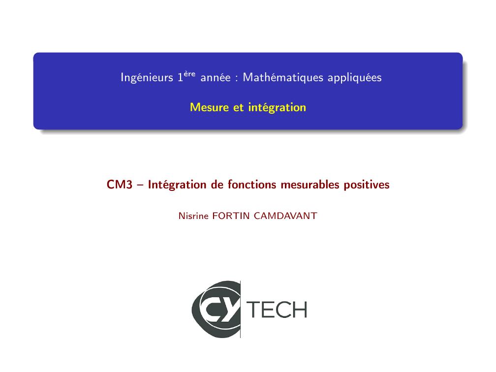 Page 1 : Ingénieurs 1ère année : Mathématiques appliquéesMesure et intégrationCM3 – Intégration de fonctions mesurables positivesNisrine FORTIN CAMDAVANT