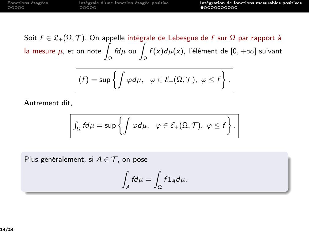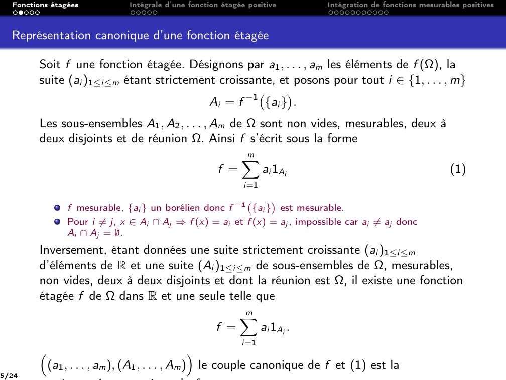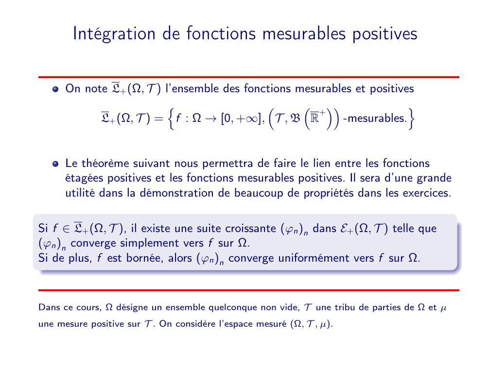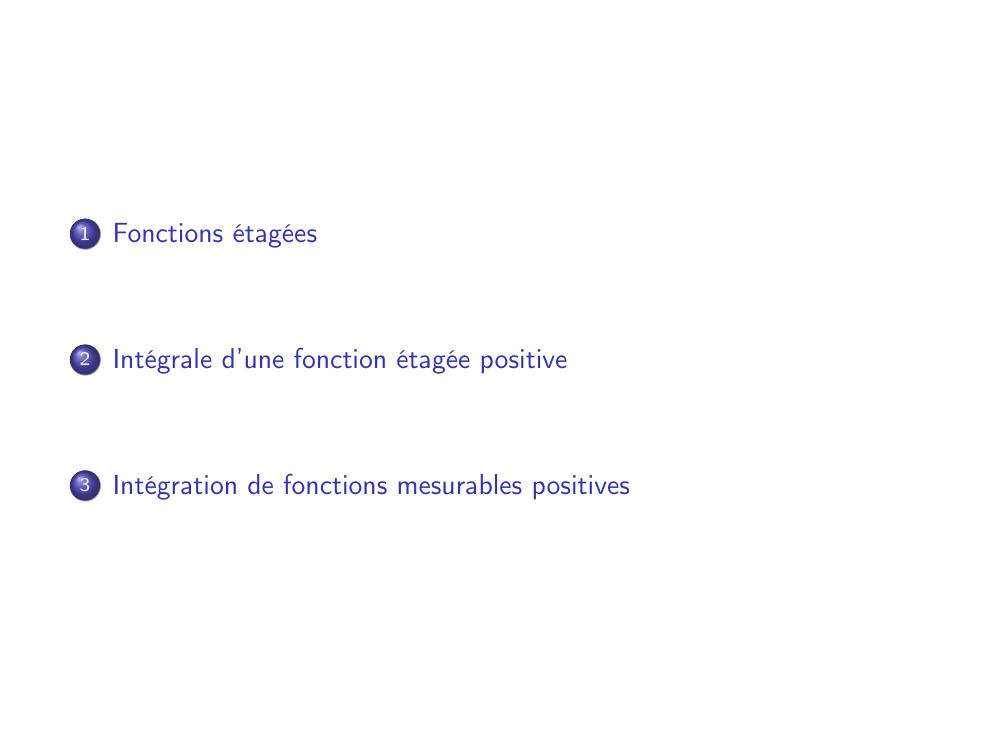 Page 2 : 1Fonctions étagées2Intégrale d’une fonction étagée positive3Intégration de fonctions mesurables positives