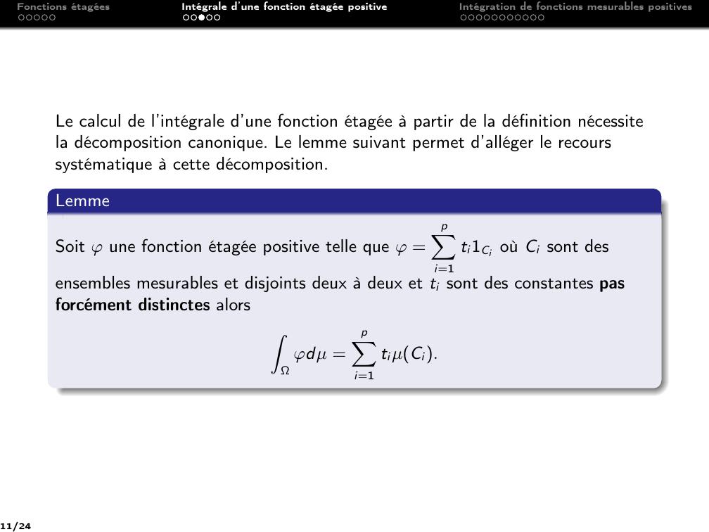 Page 11 : Fonctions étagéesIntégrale d’une fonction étagée positiveIntégration de fonctions mesurables positivesLe calcul de l’intégrale d’une fonction étagée à partir de la définition nécessitela décomposition canonique. Le lemme suivant permet d’alléger le recourssystématique à cette décomposition.LemmeSoit φ une fonction étagée positive telle que φ =pXi=1ti1Ci où Ci sont desensembles mesurables et disjoints deux à deux et ti sont des constantes pasforcément distinctes alorsZΩφdµ =pXi=1tiµCi.11/24
