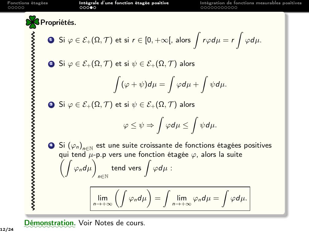 Page 12 : Fonctions étagéesIntégrale d’une fonction étagée positiveIntégration de fonctions mesurables positives1Si φ E+Ω, T et si r 0, +, alorsZrφdµ = rZφdµ.2Si φ E+Ω, T et si ψ E+Ω, T alorsZφ + ψdµ =Zφdµ +Zψdµ.3Si φ E+Ω, T et si ψ E+Ω, T alorsφ ψ ⇒Zφdµ Zψdµ.4Si φnnN est une suite croissante de fonctions étagées positivesqui tend µ-p.p vers une fonction étagée φ, alors la suiteZφndµnNtend versZφdµ :limn→+Zφndµ=Zlimn→+φndµ =Zφdµ.Propriétés.::::::::::::Démonstration. Voir Notes de cours.12/24