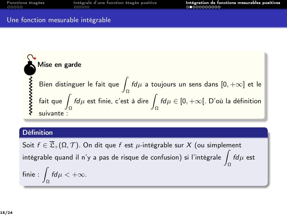 Page 15 : Fonctions étagéesIntégrale d’une fonction étagée positiveIntégration de fonctions mesurables positivesUne fonction mesurable intégrableBien distinguer le fait queZΩfdµ a toujours un sens dans 0, + et lefait queZΩfdµ est finie, c’est à direZΩfdµ 0, +. D’où la définitionsuivante :Mise en gardeDéfinitionSoit f L+Ω, T . On dit que f est µ-intégrable sur X ou simplementintégrable quand il n’y a pas de risque de confusion si l’intégraleZΩfdµ estfinie :ZΩfdµ +.15/24