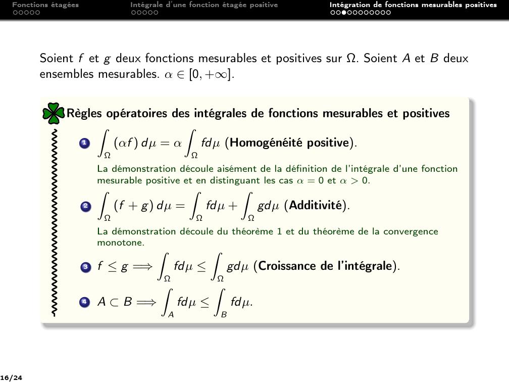 Page 16 : Fonctions étagéesIntégrale d’une fonction étagée positiveIntégration de fonctions mesurables positivesSoient f et g deux fonctions mesurables et positives sur Ω. Soient A et B deuxensembles mesurables. α 0, +.1ZΩαf dµ = αZΩfdµ Homogénéité positive.La démonstration découle aisément de la définition de l’intégrale d’une fonctionmesurable positive et en distinguant les cas α = 0 et α 0.2ZΩf + g dµ =ZΩfdµ +ZΩgdµ Additivité.La démonstration découle du théorème 1 et du théorème de la convergencemonotone.3 f g =⇒ZΩfdµ ZΩgdµ Croissance de l’intégrale.4A B =⇒ZAfdµ ZBfdµ.Règles opératoires des intégrales de fonctions mesurables et positives16/24