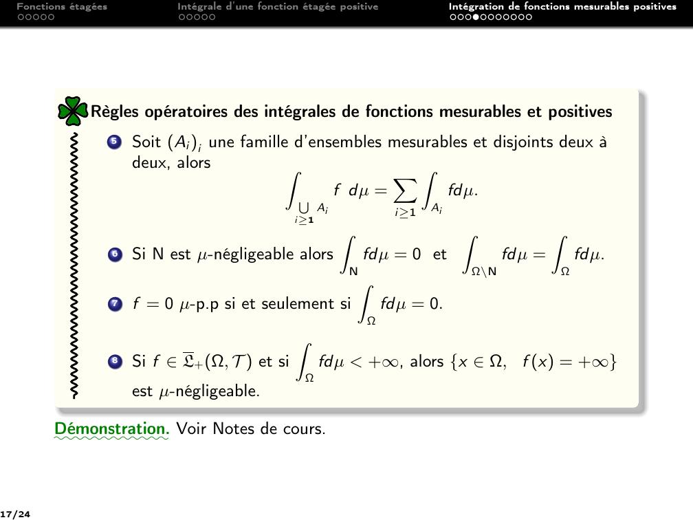 Page 17 : Fonctions étagéesIntégrale d’une fonction étagée positiveIntégration de fonctions mesurables positives5Soit Aii une famille d’ensembles mesurables et disjoints deux àdeux, alorsZSi1Aif dµ =Xi1ZAifdµ.6Si N est µ-négligeable alorsZNfdµ = 0 etZΩ\Nfdµ =ZΩfdµ.7f = 0 µ-p.p si et seulement siZΩfdµ = 0.8Si f L+Ω, T et siZΩfdµ +, alors x Ω,f x = +est µ-négligeable.Règles opératoires des intégrales de fonctions mesurables et positives::::::::::::Démonstration. Voir Notes de cours.17/24