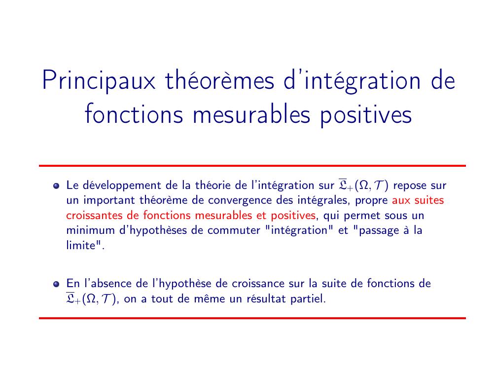 Page 18 : Principaux théorèmes d’intégration defonctions mesurables positivesLe développement de la théorie de l’intégration sur L+Ω, T repose surun important théorème de convergence des intégrales, propre aux suitescroissantes de fonctions mesurables et positives, qui permet sous unminimum d’hypothèses de commuter "intégration" et "passage à lalimite".En l’absence de l’hypothèse de croissance sur la suite de fonctions deL+Ω, T , on a tout de même un résultat partiel.