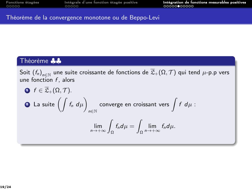 Page 19 : Fonctions étagéesIntégrale d’une fonction étagée positiveIntégration de fonctions mesurables positivesThéorème de la convergence monotone ou de Beppo-LeviThéorème ♣♣Soit fnnN une suite croissante de fonctions de L+Ω, T qui tend µ-p.p versune fonction f , alors1f L+Ω, T .2La suiteZfn dµnNconverge en croissant versZf dµ :limn→+ZΩfndµ =ZΩlimn→+fndµ.19/24