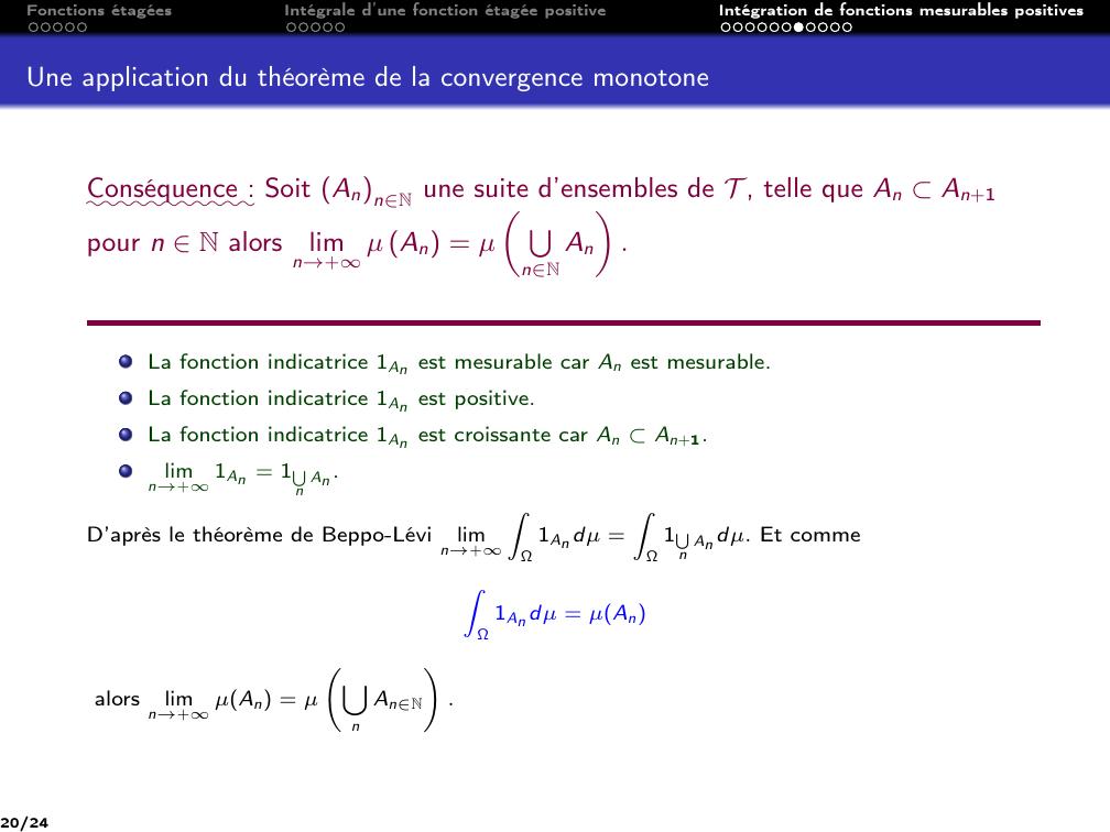 Page 20 : Fonctions étagéesIntégrale d’une fonction étagée positiveIntégration de fonctions mesurables positivesUne application du théorème de la convergence monotone::::::::::Conséquence:: Soit AnnN une suite d’ensembles de T , telle que An An+1pour n N alorslimn→+µ An = µ SnNAn.La fonction indicatrice 1An est mesurable car An est mesurable.La fonction indicatrice 1An est positive.La fonction indicatrice 1An est croissante car An An+1.limn→+1An = 1SnAn .D’après le théorème de Beppo-Lévilimn→+ZΩ1An dµ =ZΩ1SnAn dµ. Et commeZΩ1An dµ = µAnalorslimn→+µAn = µ nAnN!.20/24