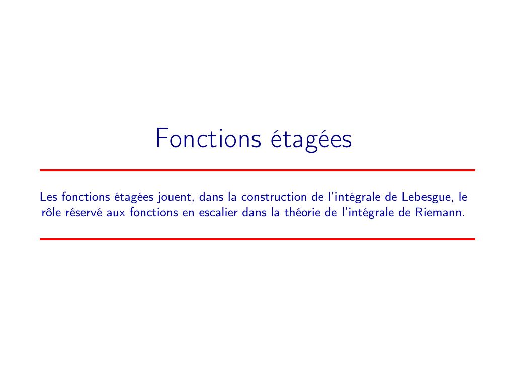 Page 3 : Fonctions étagéesLes fonctions étagées jouent, dans la construction de l’intégrale de Lebesgue, lerôle réservé aux fonctions en escalier dans la théorie de l’intégrale de Riemann.