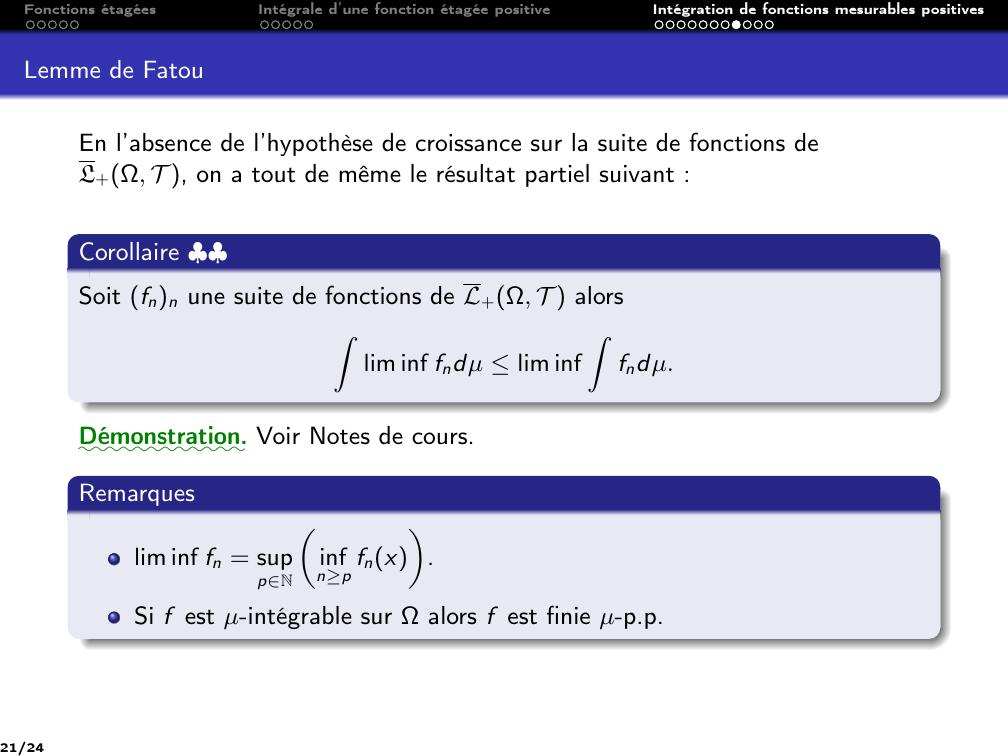 Page 21 : Fonctions étagéesIntégrale d’une fonction étagée positiveIntégration de fonctions mesurables positivesLemme de FatouEn l’absence de l’hypothèse de croissance sur la suite de fonctions deL+Ω, T , on a tout de même le résultat partiel suivant :Corollaire ♣♣Soit fnn une suite de fonctions de L+Ω, T alorsZlim inf fndµ lim infZfndµ.::::::::::::Démonstration. Voir Notes de cours.Remarqueslim inf fn = suppNinfnp fnx.Si f est µ-intégrable sur Ωalors f est finie µ-p.p.21/24