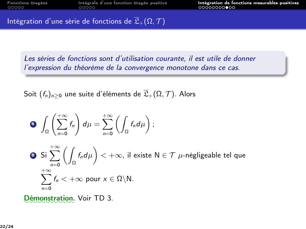 Page 22 : Fonctions étagéesIntégrale d’une fonction étagée positiveIntégration de fonctions mesurables positivesIntégration d’une série de fonctions de L+Ω, T Les séries de fonctions sont d’utilisation courante, il est utile de donnerl’expression du théorème de la convergence monotone dans ce cas.Soit fnn0 une suite d’éléments de L+Ω, T . Alors1ZΩ +Xn=0fn!dµ =+Xn=0ZΩfndµ;2Si+Xn=0ZΩfndµ +, il existe N T µ-négligeable tel que+Xn=0fn +pour x Ω\N.::::::::::::Démonstration. Voir TD 3.22/24