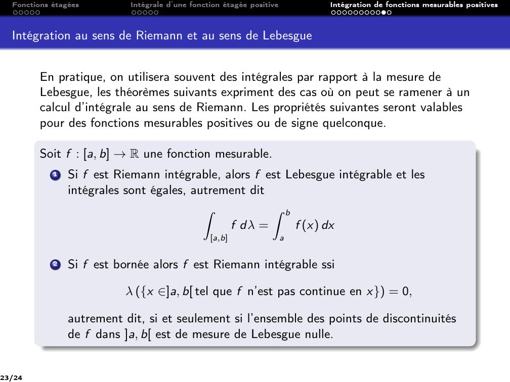 Page 23 : Fonctions étagéesIntégrale d’une fonction étagée positiveIntégration de fonctions mesurables positivesIntégration au sens de Riemann et au sens de LebesgueEn pratique, on utilisera souvent des intégrales par rapport à la mesure deLebesgue, les théorèmes suivants expriment des cas où on peut se ramener à uncalcul d’intégrale au sens de Riemann. Les propriétés suivantes seront valablespour des fonctions mesurables positives ou de signe quelconque.Soit f : a, b →R une fonction mesurable.1Si f est Riemann intégrable, alors f est Lebesgue intégrable et lesintégrales sont égales, autrement ditZa,bf dλ =Z baf x dx2Si f est bornée alors f est Riemann intégrable ssiλ x a, b tel que f n’est pas continue en x = 0,autrement dit, si et seulement si l’ensemble des points de discontinuitésde f dans a, b est de mesure de Lebesgue nulle.23/24
