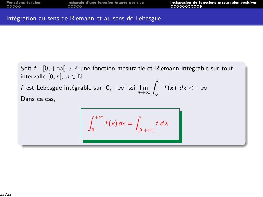 Page 24 : Fonctions étagéesIntégrale d’une fonction étagée positiveIntégration de fonctions mesurables positivesIntégration au sens de Riemann et au sens de LebesgueSoit f : 0, +→R une fonction mesurable et Riemann intégrable sur toutintervalle 0, n, n N.f est Lebesgue intégrable sur 0, + ssi limn→Z n0f x dx +.Dans ce cas,Z +0f x dx =Z0,+f dλ.24/24