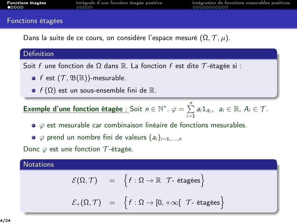 Page 4 : Fonctions étagéesIntégrale d’une fonction étagée positiveIntégration de fonctions mesurables positivesFonctions étagéesDans la suite de ce cours, on considère l’espace mesuré Ω, T , µ.DéfinitionSoit f une fonction de Ωdans R. La fonction f est dite T -étagée si :f est T , BR-mesurable.f Ω est un sous-ensemble fini de R.::::::::::::::::::::::::::Exemple d’une fonction étagée : Soit n N. φ =nPi=1ai1Ai , ai R, Ai T .φ est mesurable car combinaison linéaire de fonctions mesurables.φ prend un nombre fini de valeurs aii=1,...,nDonc φ est une fonction T -étagée.NotationsEΩ, T =nf : Ω→R T - étagéesoE+Ω, T =nf : Ω→0, + T - étagéeso4/24