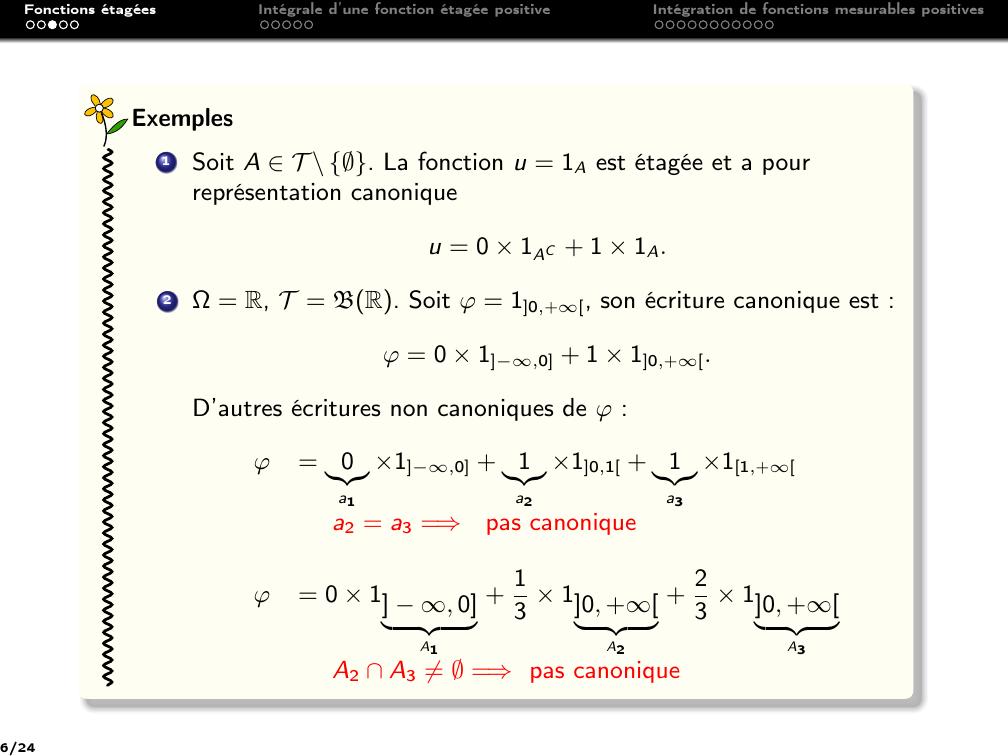 Page 6 : Fonctions étagéesIntégrale d’une fonction étagée positiveIntégration de fonctions mesurables positives1Soit A T \ . La fonction u = 1A est étagée et a pourreprésentation canoniqueu = 0 × 1AC + 1 × 1A.2Ω= R, T = BR. Soit φ = 10,+, son écriture canonique est :φ = 0 × 1,0 + 1 × 10,+.D’autres écritures non canoniques de φ :φ=0za1×1,0 +1za2×10,1 +1za3×11,+a2 = a3 =⇒pas canoniqueφ= 0 × 1 , 0zA1+ 13 × 10, + z A2+ 23 × 10, + z A3A2 A3 ̸= =⇒pas canoniqueExemples6/24