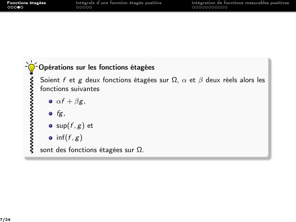 Page 7 : Fonctions étagéesIntégrale d’une fonction étagée positiveIntégration de fonctions mesurables positivesSoient f et g deux fonctions étagées sur Ω, α et β deux réels alors lesfonctions suivantesαf + βg,fg,supf , g etinff , gsont des fonctions étagées sur Ω.Opérations sur les fonctions étagées7/24