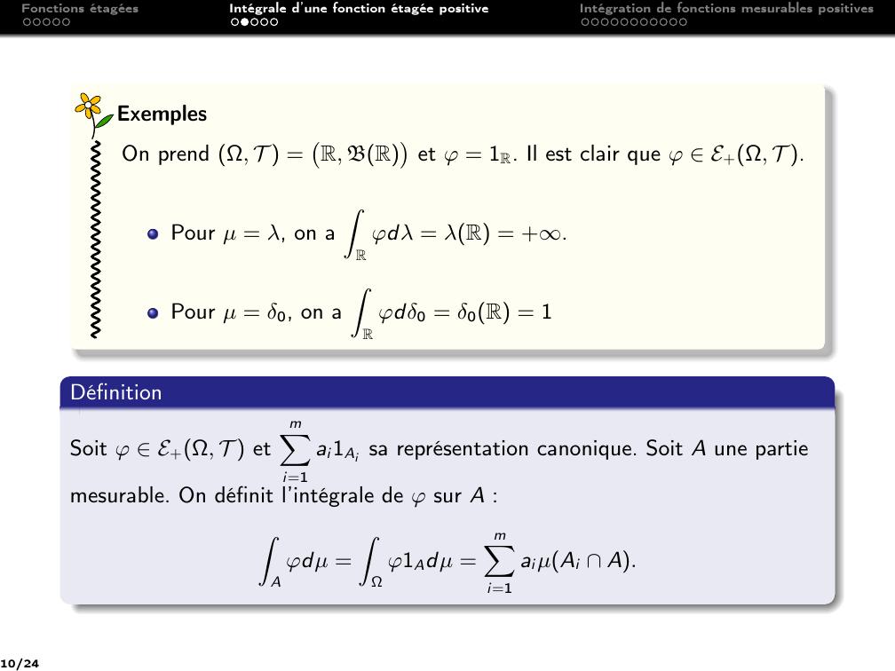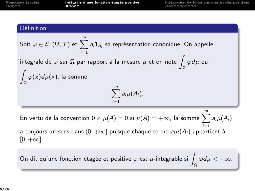 Page 9 : Fonctions étagéesIntégrale d’une fonction étagée positiveIntégration de fonctions mesurables positivesDéfinitionSoit φ E+Ω, T etmXi=1ai1Ai sa représentation canonique. On appelleintégrale de φ sur Ωpar rapport à la mesure µ et on noteZΩφdµ ouZΩφxdµx, la sommemXi=1aiµAi.En vertu de la convention 0 × µA = 0 si µA = +, la sommemXi=1aiµAia toujours un sens dans 0, + puisque chaque terme aiµAi appartient à0, +.On dit qu’une fonction étagée et positive φ est µ-intégrable siZΩφdµ +.9/24