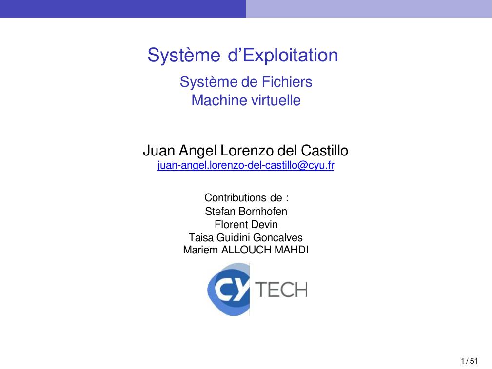 Page 1 : Système d’ExploitationSystème de Fichiers Machine virtuelleJuan Angel Lorenzo del Castillojuan-angel.lorenzo-del-castillo@cyu.frContributions de :Stefan Bornhofen Florent DevinTaisa Guidini GoncalvesMariem ALLOUCH MAHDI1/ 51