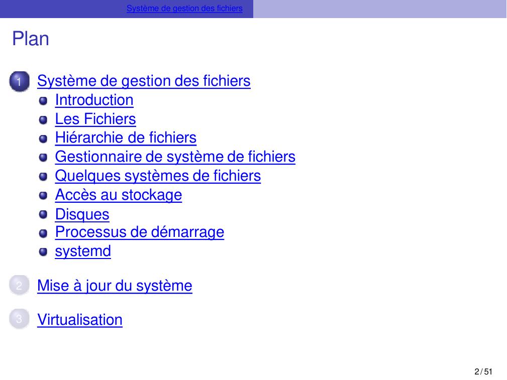 Page 2 : Système de gestion des fichiersPlan1Système de gestion des fichiersIntroductionLes FichiersHiérarchie de fichiersGestionnaire de système de fichiersQuelques systèmes de fichiersAccès au stockageDisquesProcessus de démarragesystemd2Mise à jour du systèmeVirtualisation32/ 51
